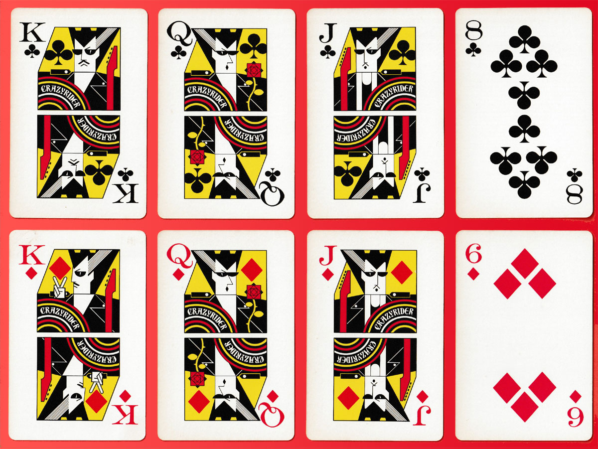 The Crazyrider (or Crazy Rider) appears to have been a rock ‘n’ roll band (and possibly also the name of a record label) in the 1980s. The stylised courts in black, red and yellow depict various musicians, with a drummer on the two Jokers. There is a non-standard arrangement of the pips on the 4s to 10s. The backs are coloured silver and black. See the box►