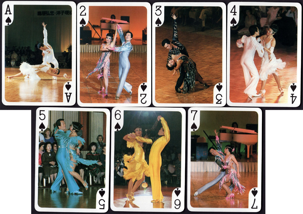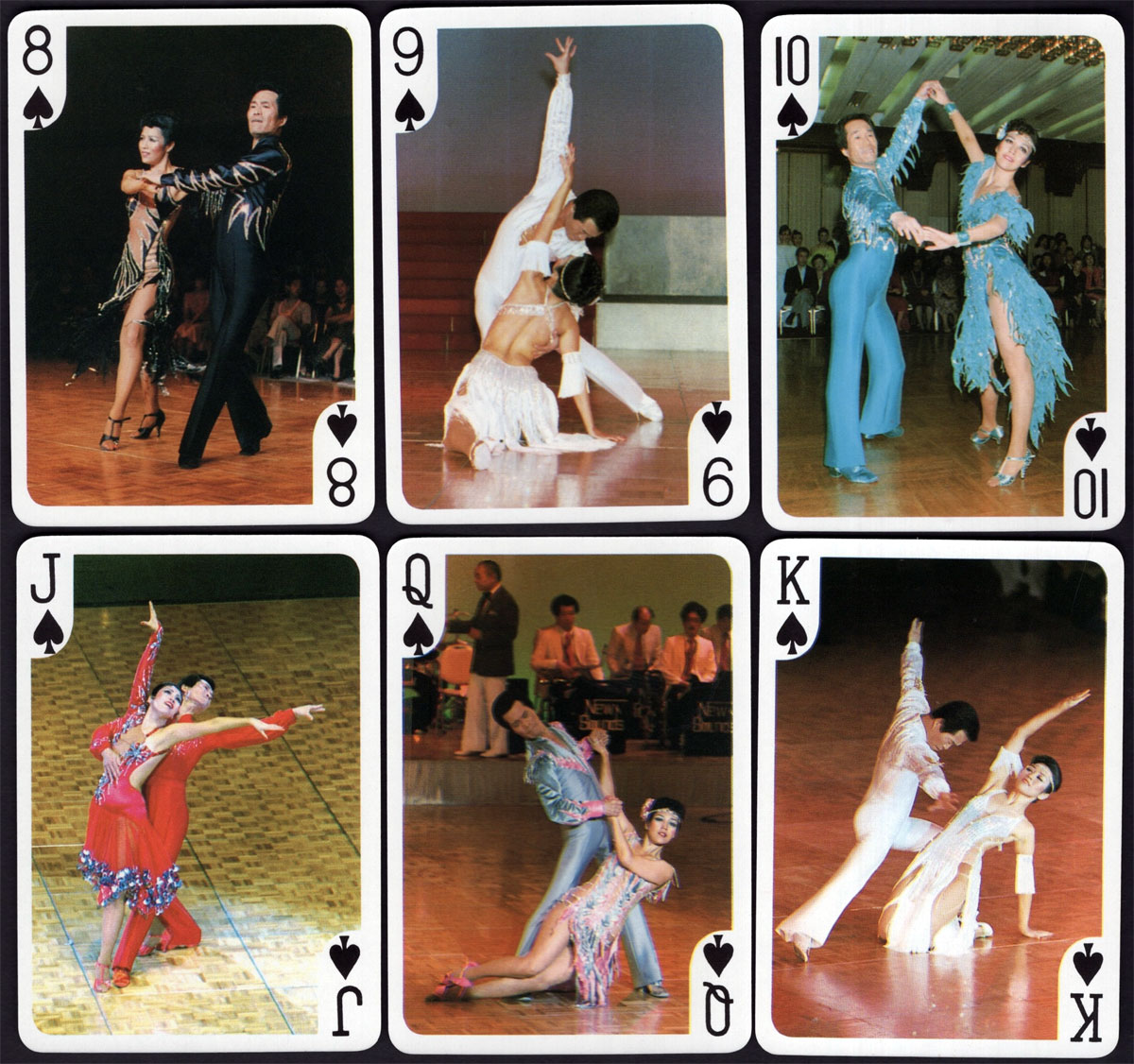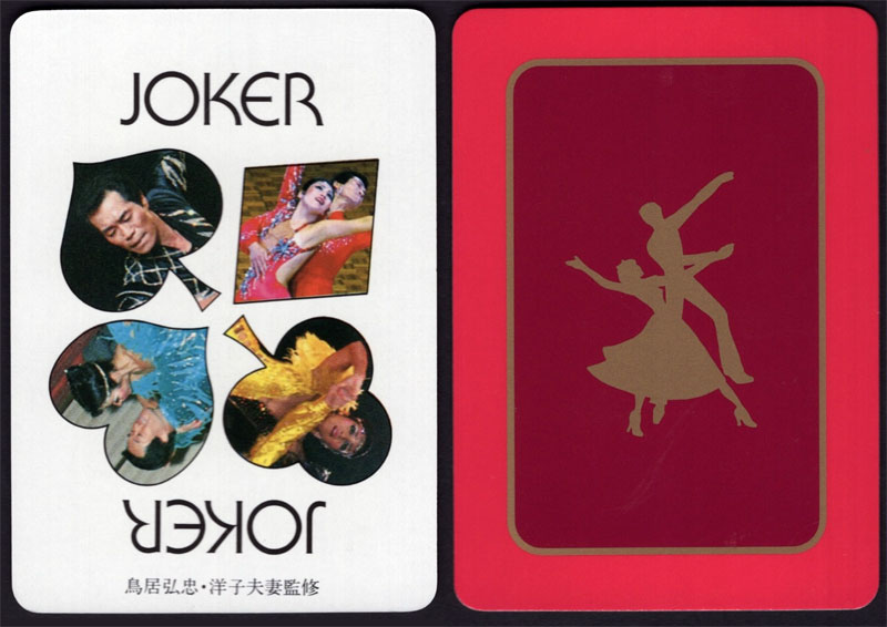 Each card has a photo of the owner of the Torii Dance School in Osaka, and his wife Yoko dancing. The images are repeated in each suit. The backs are pink with a gold silhouette of a couple dancing. The joker has a text in Chinese : 鳥居弘忠・洋子夫妻監修 which translates to: “Produced by Hirotada Torii and his wife, Yoko”. • See: Torii Dance School website►