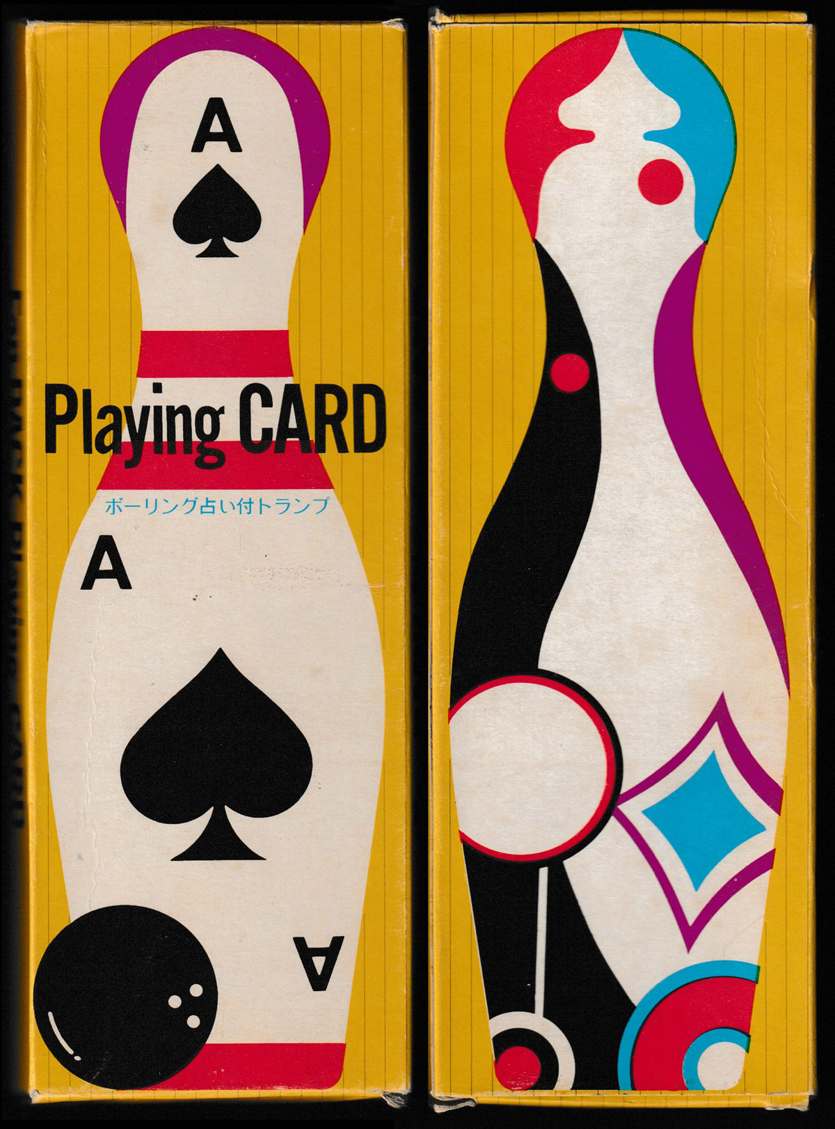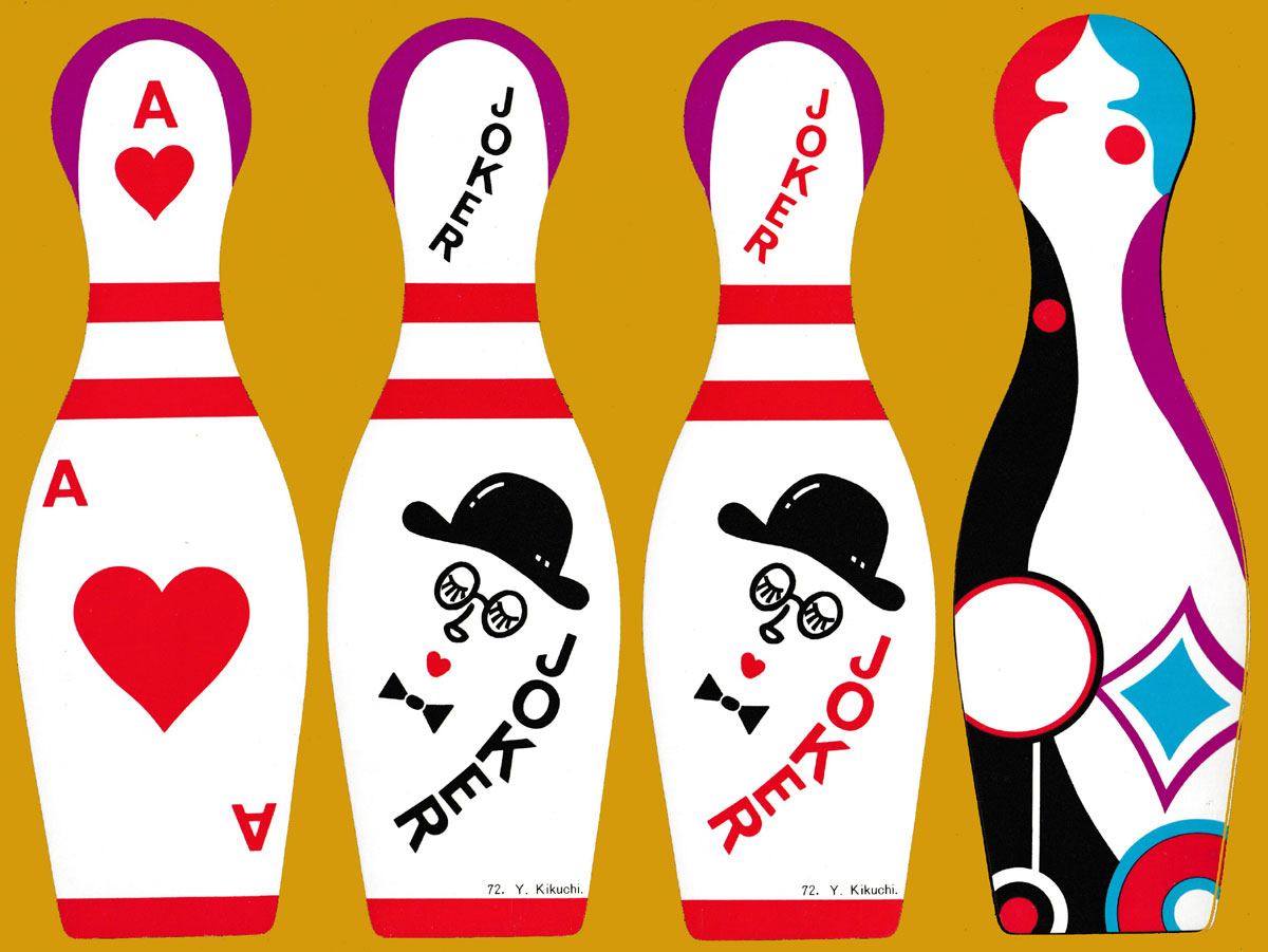 Packs of cards in unusual shapes are not uncommon nowadays (2023) but were much less common in the early 1970s. Hence, this pack must have stood out as being different. The cards are shaped like skittles or bowling pins and were almost certainly intended for fanning by magicians rather than for serious play. A standard design format has been used throughout. On the Joker one can read “72. Y. Kikuchi.”, Y. Kikuchi being the designer (Yutaka Kikuchi) and 72 being the year of production (1972). See the box►