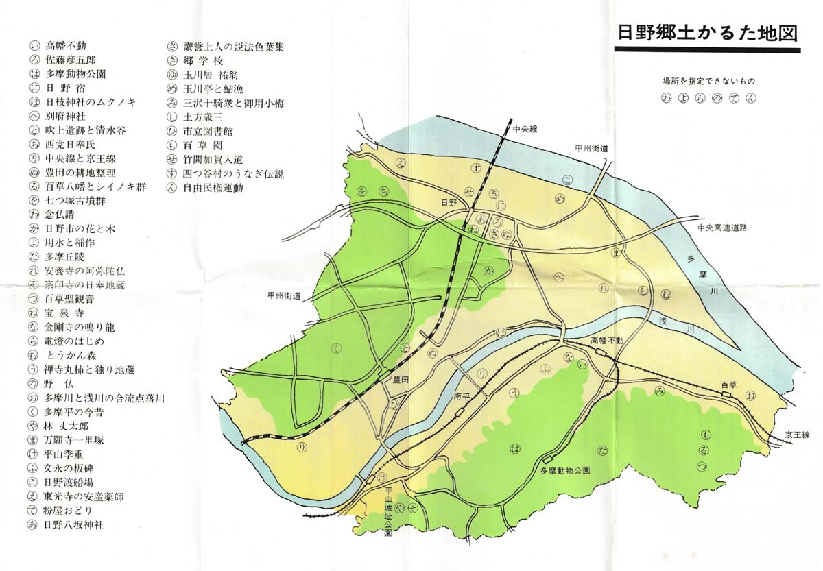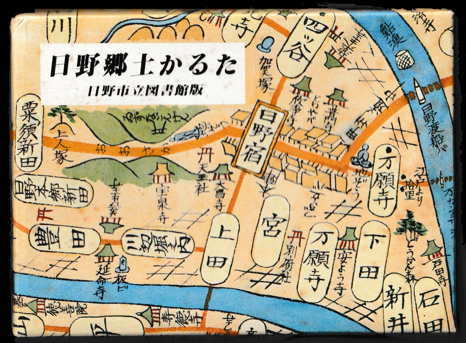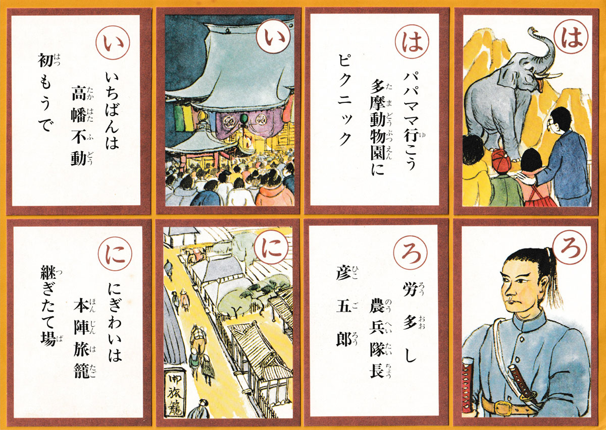 Packs of Iroha Karuta don’t always have 96 cards and don’t always depict proverbs. The present set was made for Hino City, located in the western part of Tokyo. It depicts people, places, parks and amenities connected with Hino City. This type of Iroha Karuta appears to be called Kyodo Karuta. All the locations are marked on the accompanying map