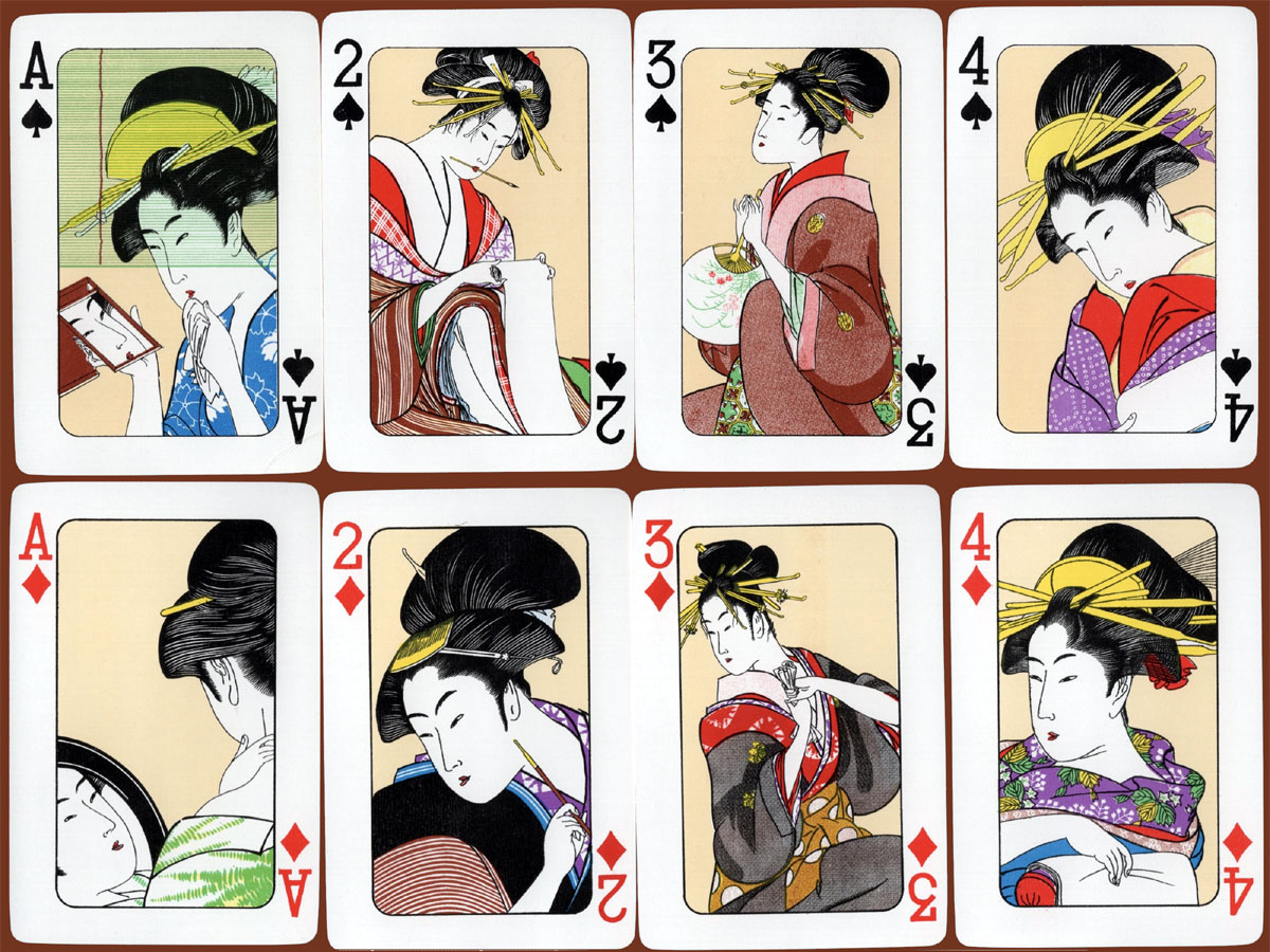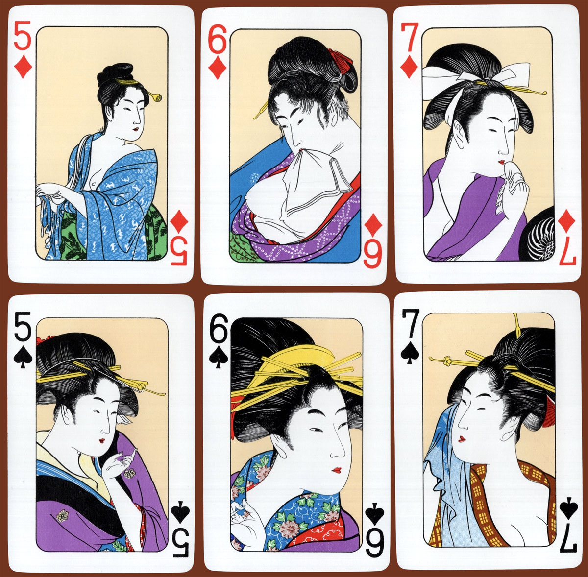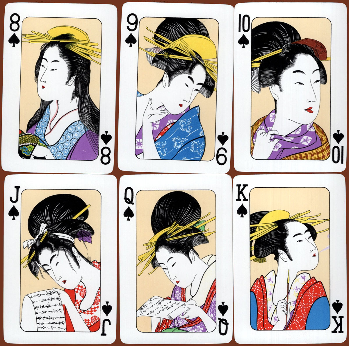 Utamaro Ukiyo-e playing cards showing woodblock prints of beautiful women.