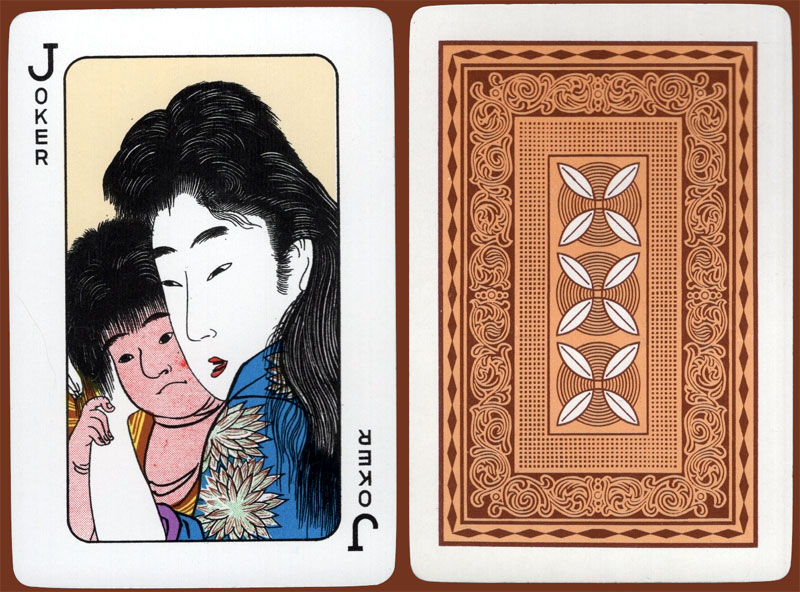 The western card structure is preserved (J, Q, K indices), but the imagery is replaced with Japanese portraiture. Instead of the typical jester, the Joker portrays what looks like a woman with a child; the reverse side has a symmetrical, western-style ornamental pattern in brown and cream.