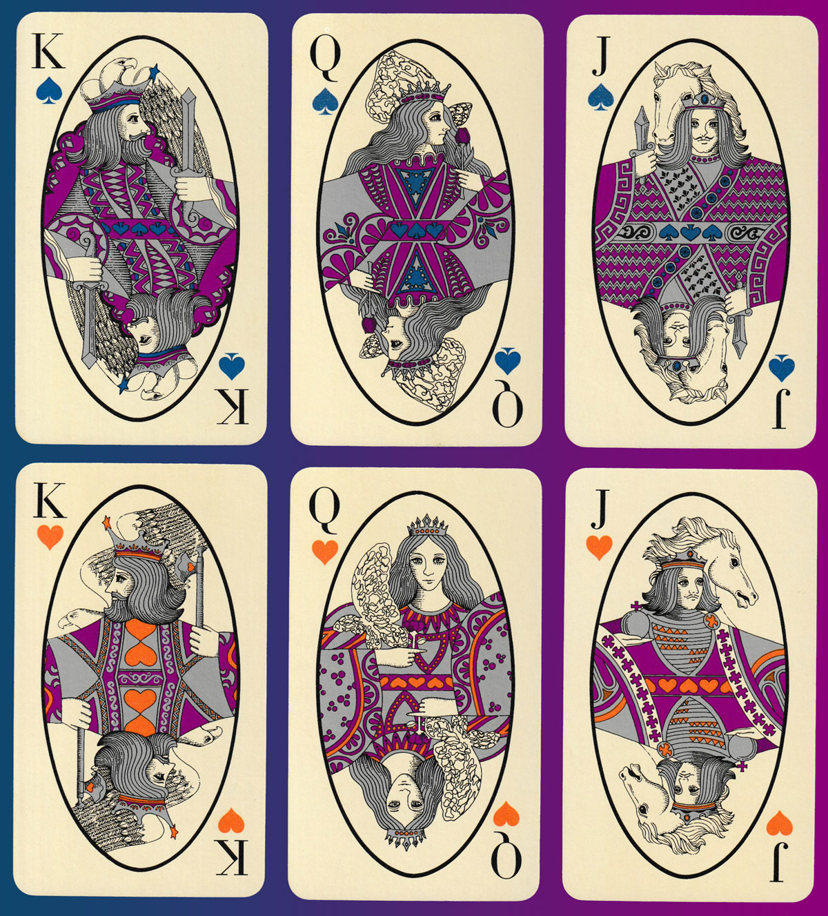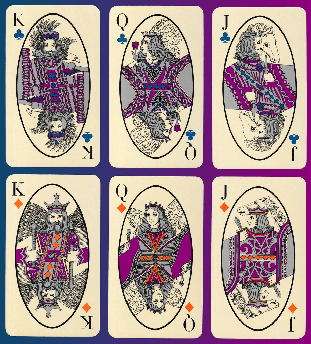 Attractive, non-standard, double-ended courts, each in an oval frame. The red-suit pips are printed in orange and the black-suit pips in blue. In addition to orange and blue, the colours silver and purple are used extensively on the court cards to great effect. Behind the Kings is an eagle, behind the Queens is a butterfly, and behind the Jacks is a horse. All the pips are arranged vertically down the centre of each card. A cream background is used throughout, while the backs are printed in black and gold with “LASER CLAY” across the centre. The cards are elongated.