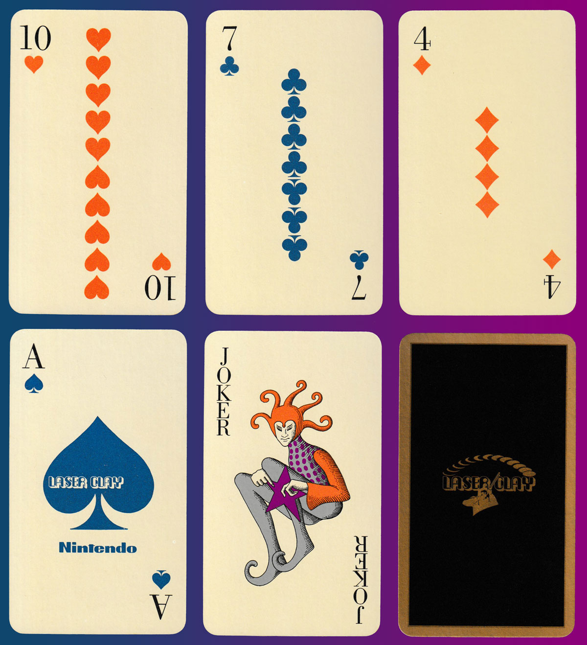 Above: Laser Clay playing cards made by Nintendo PC Co. Ltd, Kyoto, Japan, 1973. 52 cards + 2 (identical) Jokers in plastic box. Size: 58.5 x 100.5 mm.