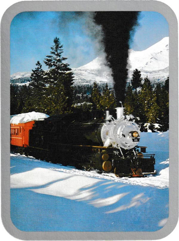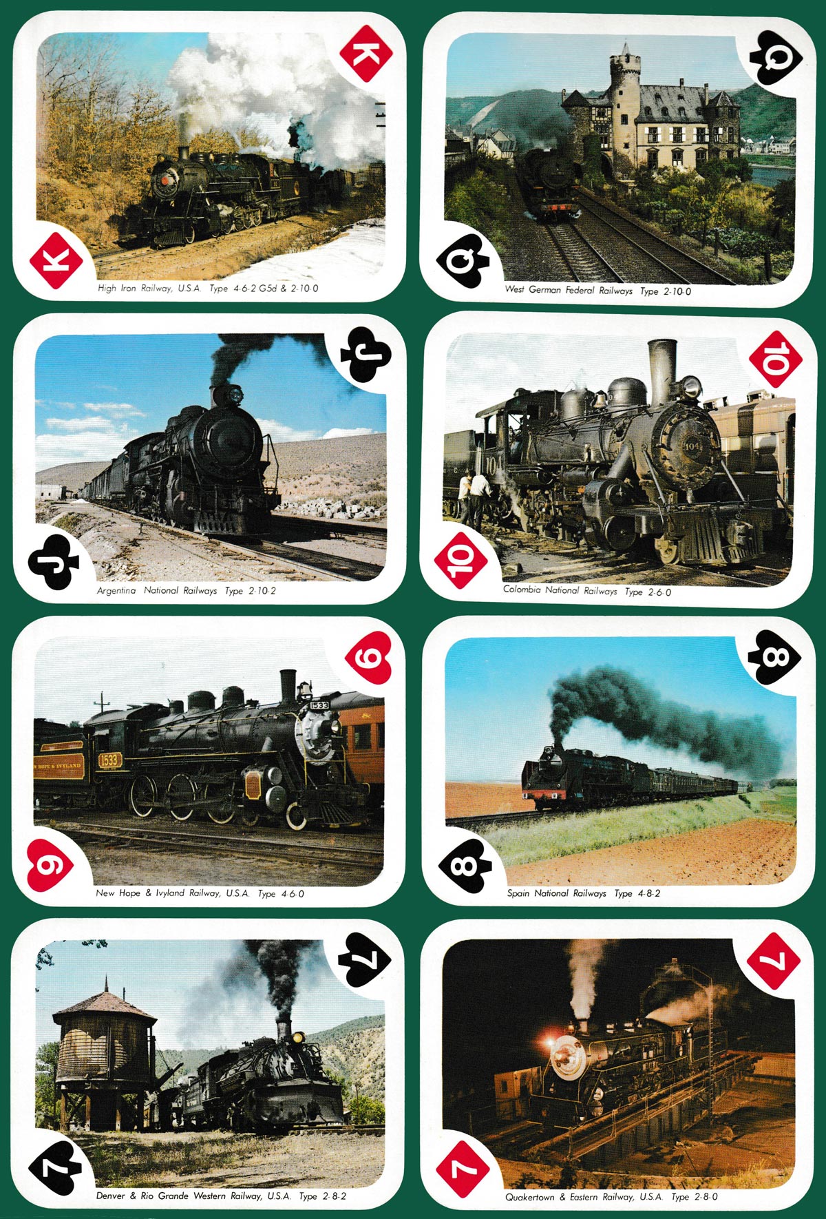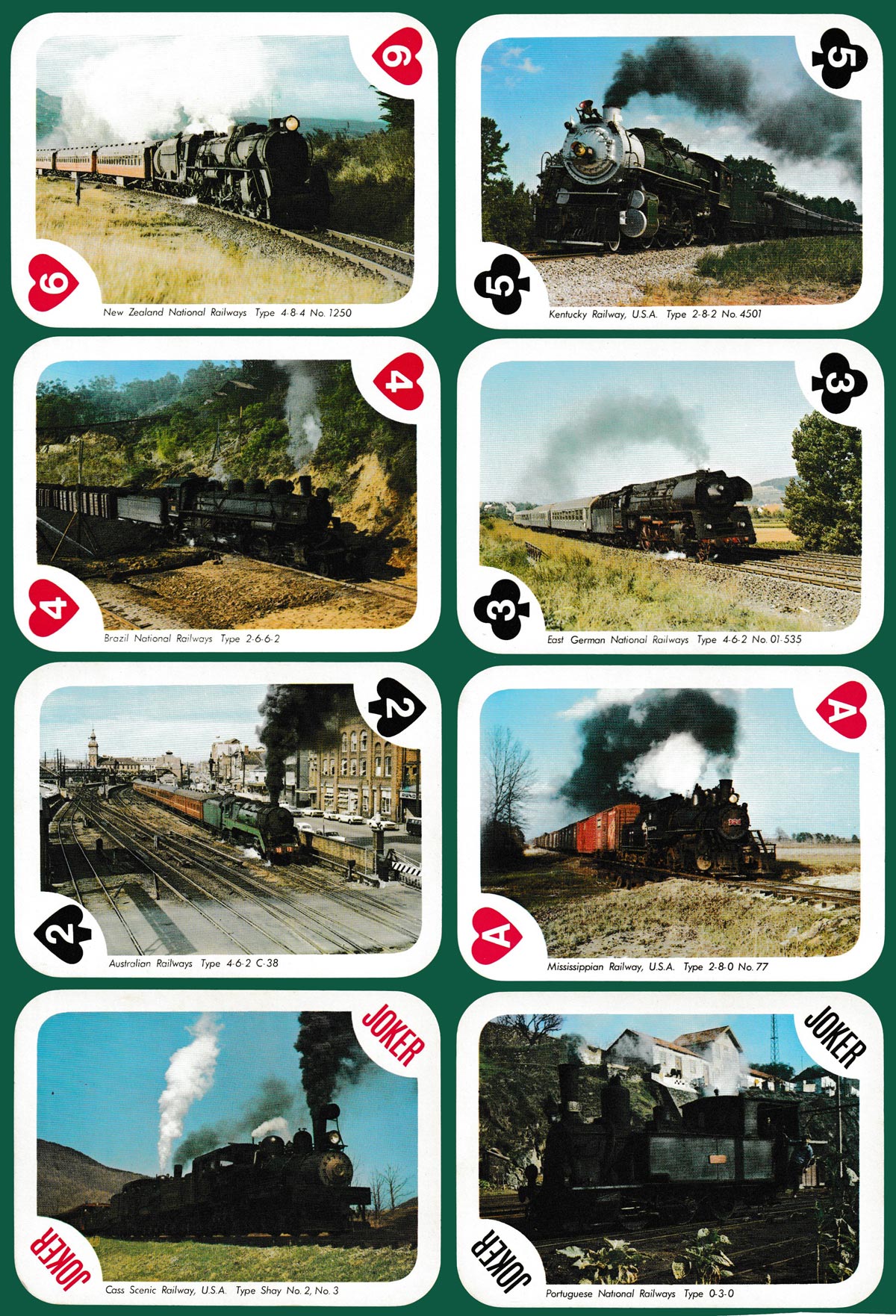 The fine colour photographs of steam locomotives from around the world bear witness to a bygone era. The horizontal format works better for the subject matter on this occasion. Each locomotive is shown with the country where it saw service together with the type number. The indices are superimposed on the suit-signs in two corners. On the back, in vertical format and within a silver border, is a steam locomotive from California ploughing its way through snowy scenery.