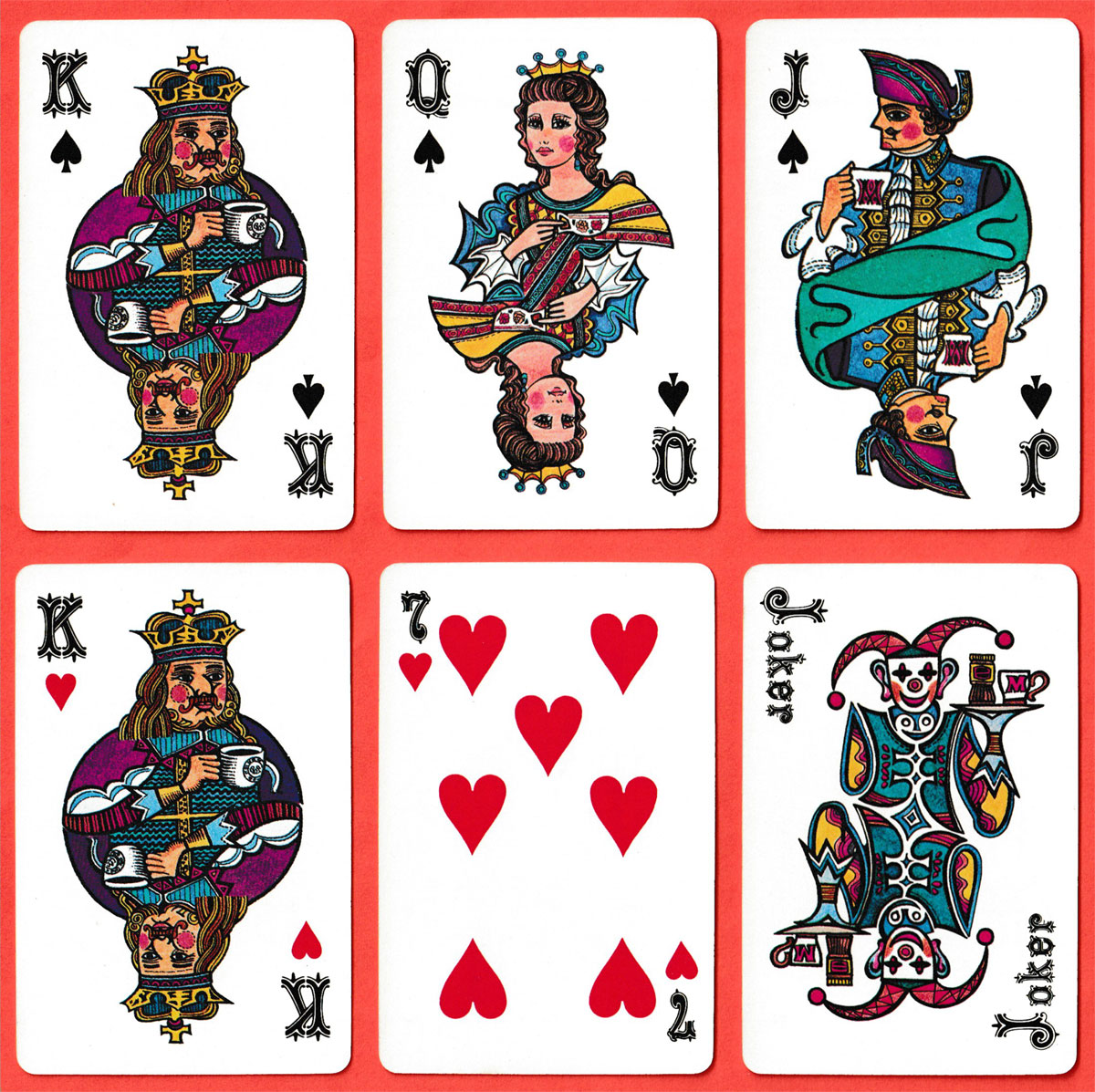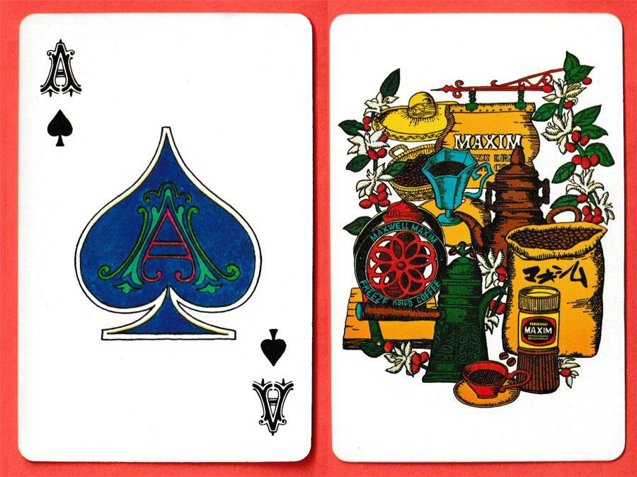For once it is the back design which is more interesting than the court cards: on it one can find coffee plants, a basket and a sack of coffee beans, an old sign and an old cup, coffee pots, etc., advertising Maxim freeze dried coffee (a Maxwell House brand). The non-standard, double-ended courts are dressed in historical costume and are shown drinking cups of coffee. The court card designs are the same in each suit. There is a special Ace of Spades. A fancy style of lettering has been used for the indices which are all black, even on the red suits. An edition of 3,000 packs.
