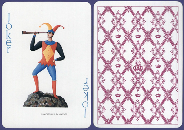 The joker depicts a harlequin standing on a rock, looking through a telescope into the distance with the legend ‘Manufactured by Nintendo’ at the bottom. In complete contrast to the prevailing artistic style on the faces, the back design presents a formal, repeating diamond lattice in reddish-purple, with small crowns and a lion on the central crown. This resembles a form of prestigious branding, but we are unaware of any external affiliation or even a title.