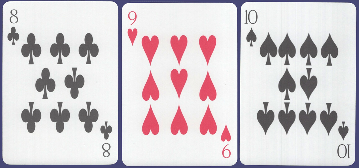 Joop Muller comments “The name [Morinaga Hakuho] was printed on a small piece of paper, glued to the white carton sleeve in which the plastic box with the deck was. This is not unusual. I've had and probably still have some decks in those ‘named’ white carton sleeves”. The pip cards have the symbols arranged in symmetrical layouts. It has not been possible to find any more background information about this deck. There seem to be 100s of Nintendo decks with not much identification, perhaps private limited editions for small businesses or individual clients.