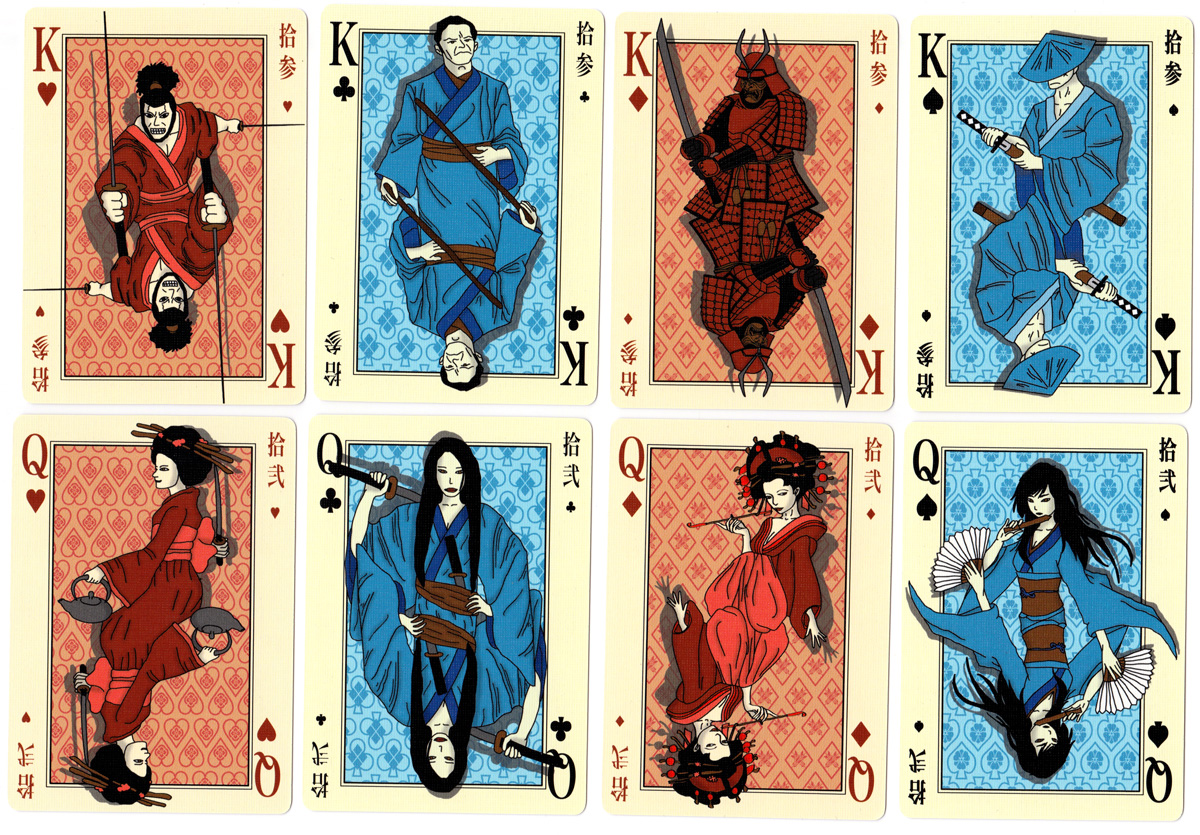 The courts have double-ended illustrations with Japanese letters in each corner. The kings are portrayed as samurai, the queens as orian, and the jacks as kunoichi. The back is a shoji, which is a Japanese sliding paper door.