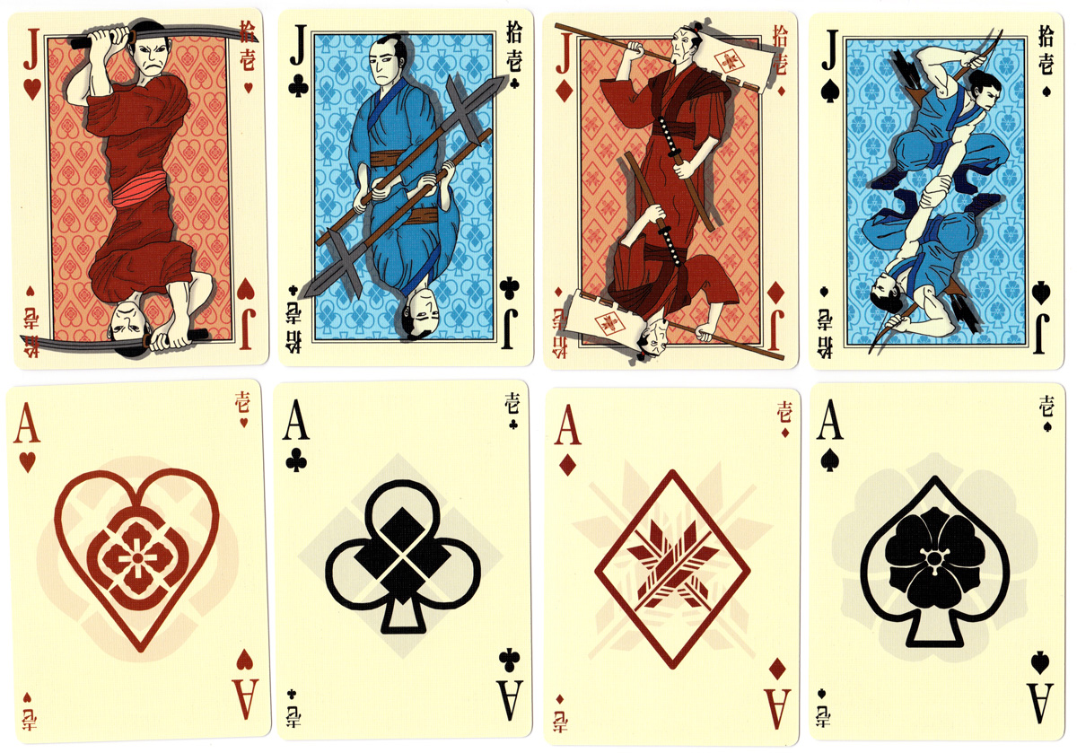 The aces are designed to look like Japanese house emblems, also known as kamon, while maintaining the traditional shape of the four suits.
