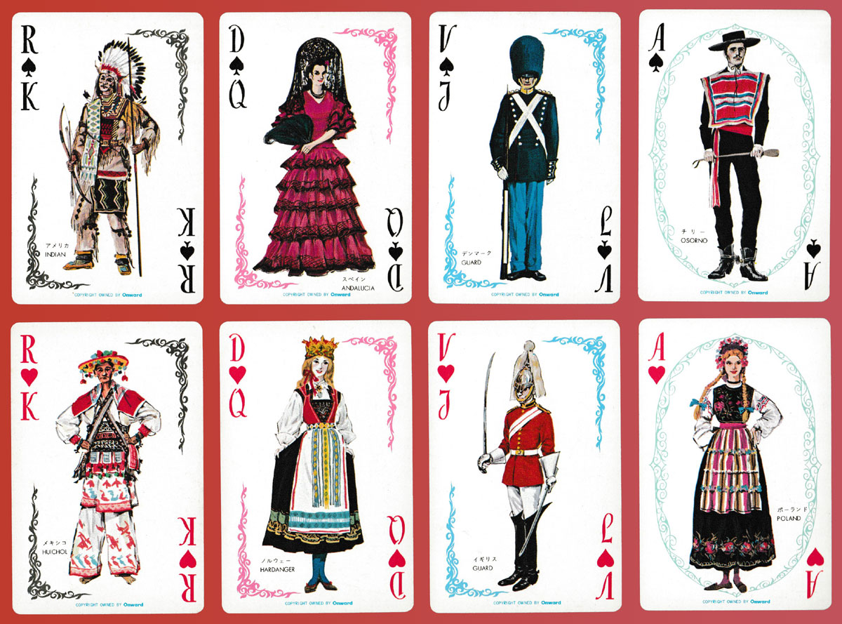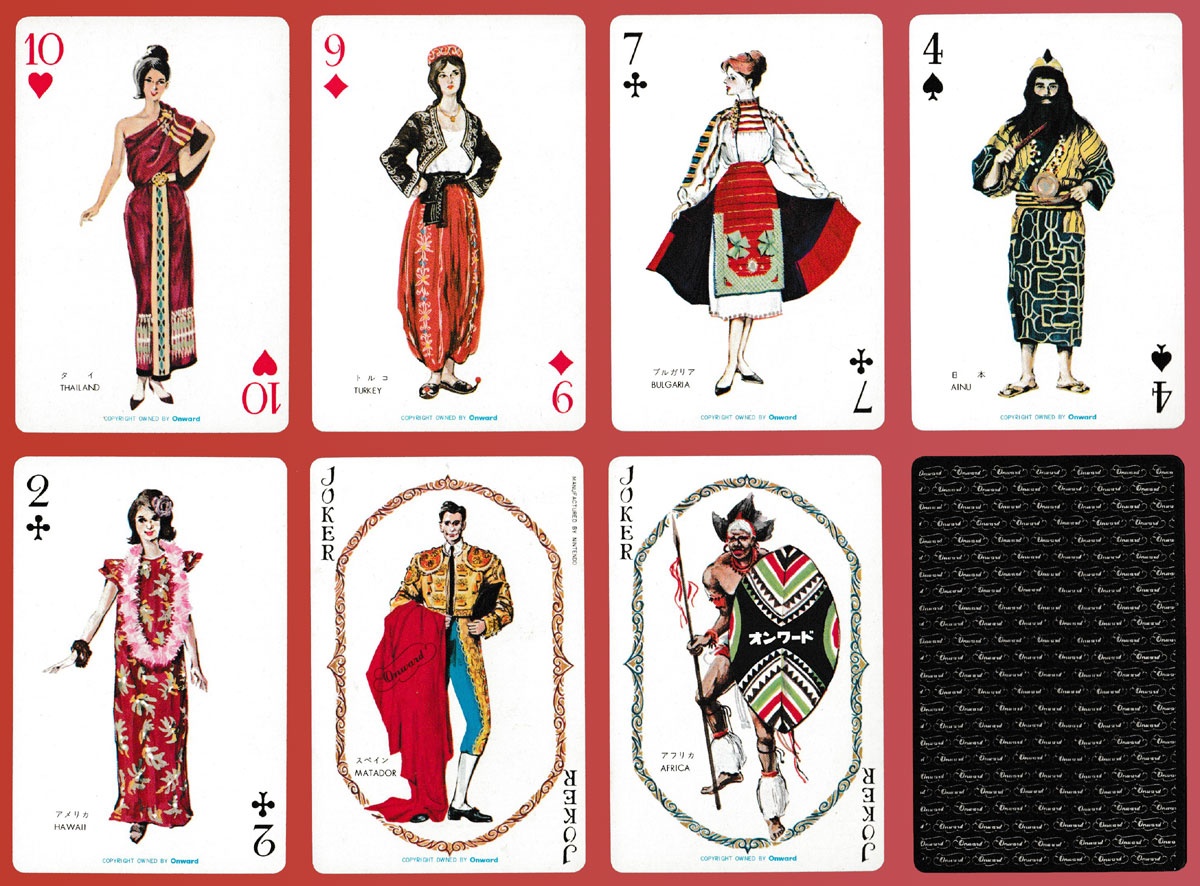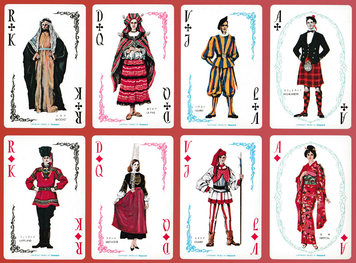 Each card features a different national costume or a costume typical of a region or activity within a particular country. There is added decoration in two corners of each court card and a decorative oval frame on each of the Aces. The indices on the court cards are in French and English. All the card titles are in Japanese and English (with some dubious spellings). On the backs the “Onward” logo is repeated many times in white on black.