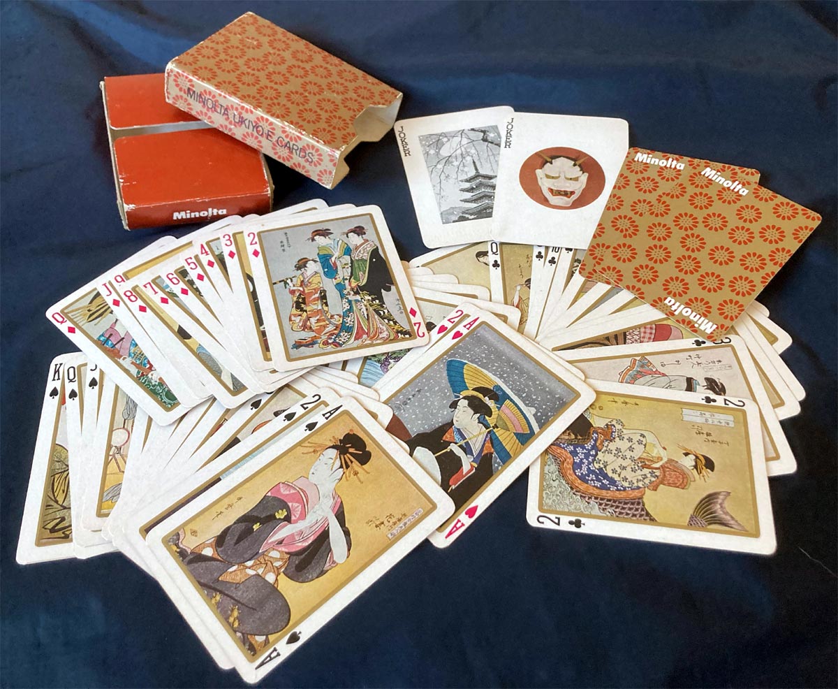 Above: Minolta Ukiyo-E deck, 52 cards + 2 jokers in telescopic box. Image courtesy Sean Comstock.