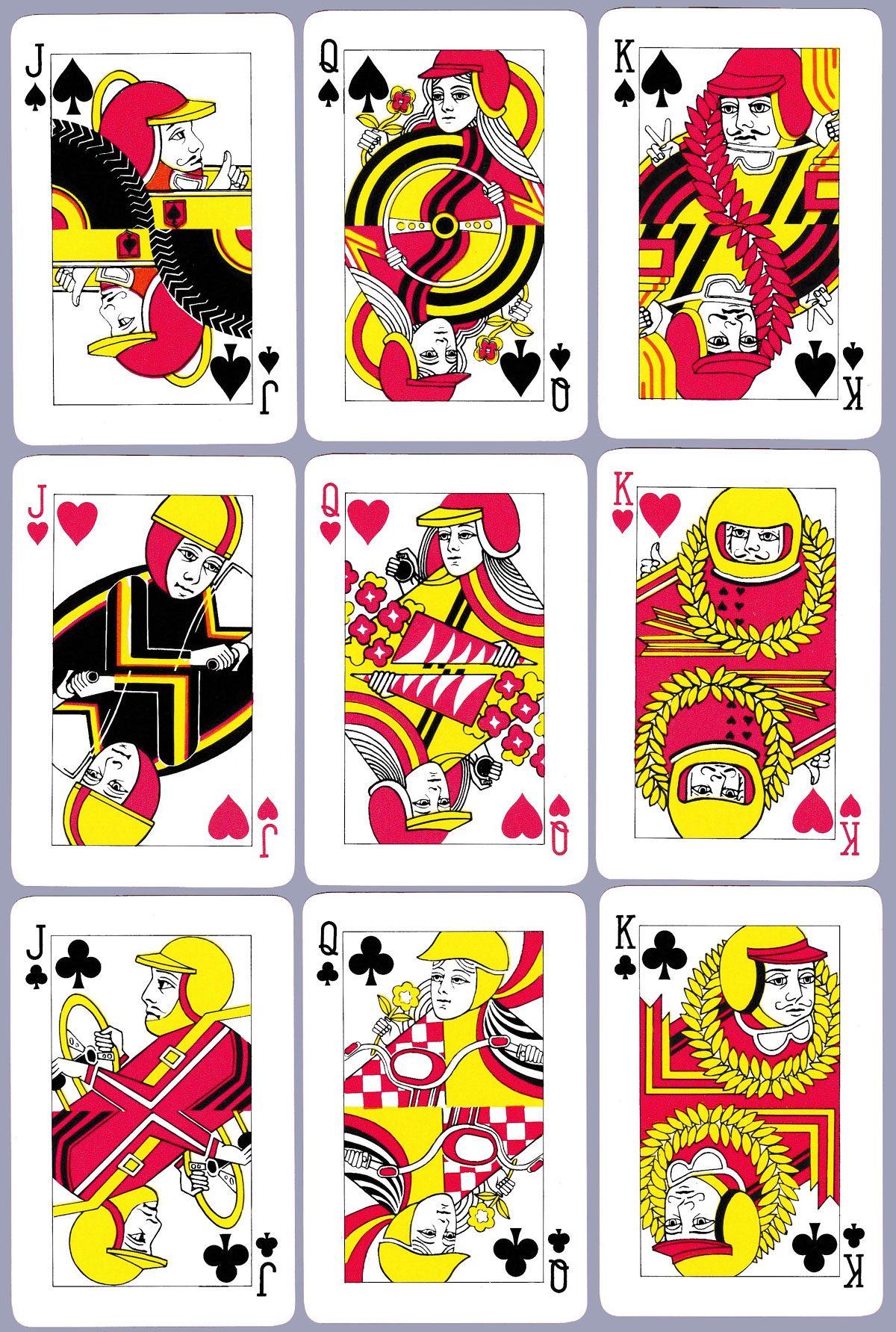 Sometimes known as “Drivers and crew” this pack was produced by Nintendo in 1978. The colourful cartoon court cards wear helmets and are engaged in activities related to motor sport, and the single special joker is signed, presumably by the artist, “K. Ando”. With the exception of the ace of spades, which displays a black & white checkered flag inside a laurel wreath, the remaining aces and court cards are standard.