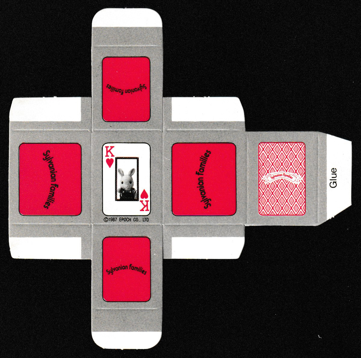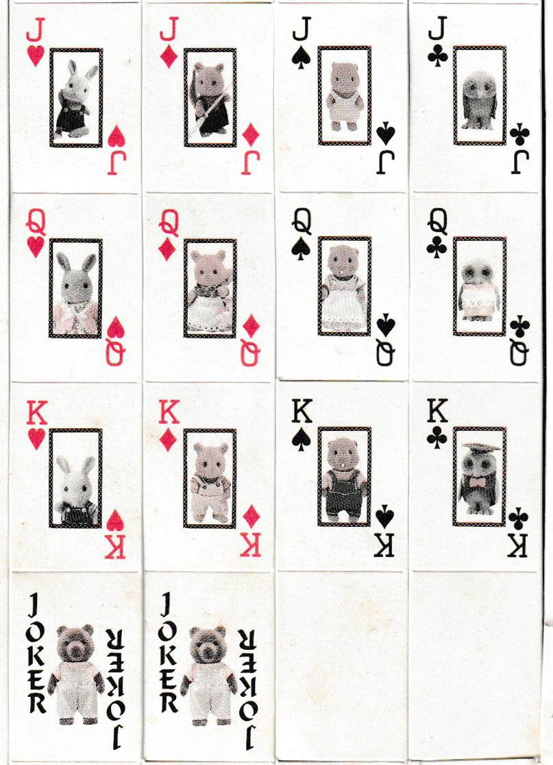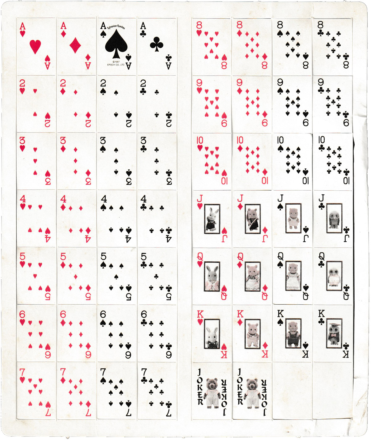 Above: Sylvanian Families press-out sheet with 52 cards + 2 (identical) Jokers + 2 blank cards, published by Epoch Co. Ltd, Japan, 1987. Card size: 16.5 x 23.5 mm. © 1987 Epoch Co. Ltd