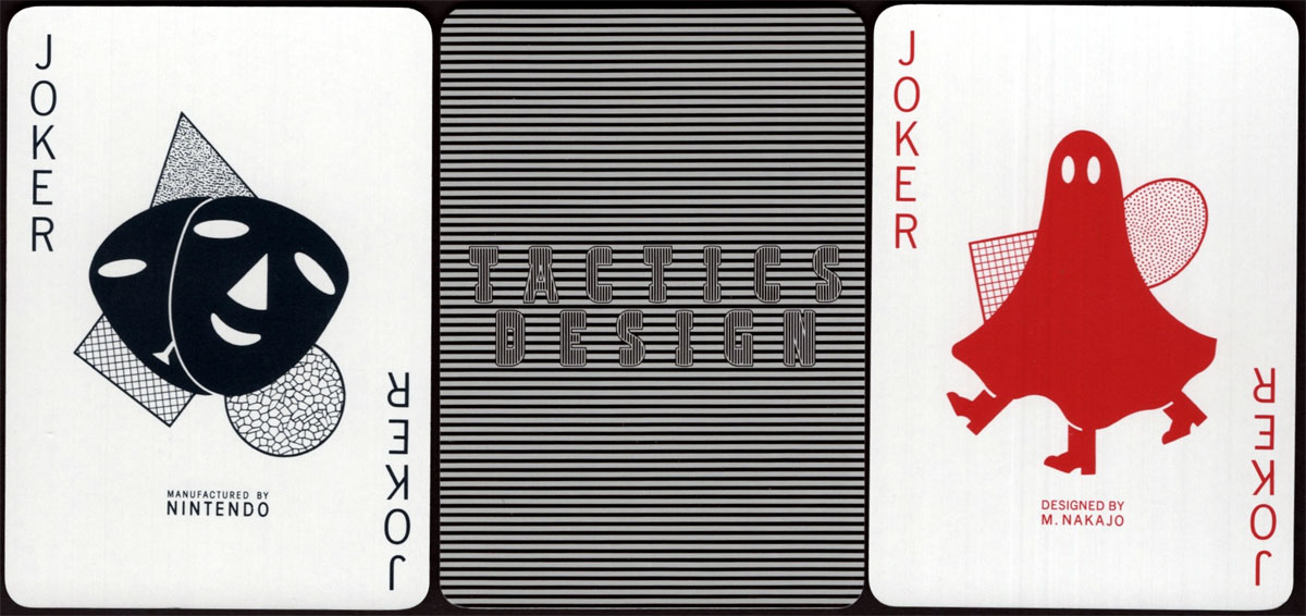 Above: Tactics Design advertising playing cards designed by Masayoshi Nakajo, manufactured by Nintendo, 1982. 52 cards + 2 jpkers in box.