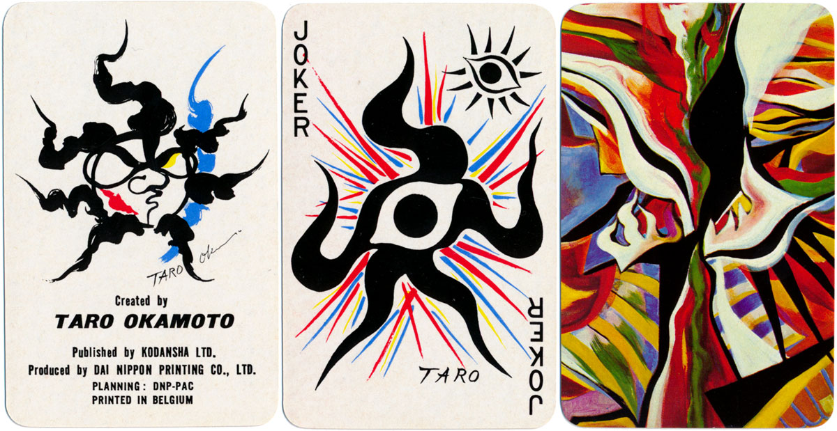 Above: Taro Okamoto playing cards, 1977. 52 cards + 2 Jokers in box. The artist's name 'Taro' appears on all the court cards.