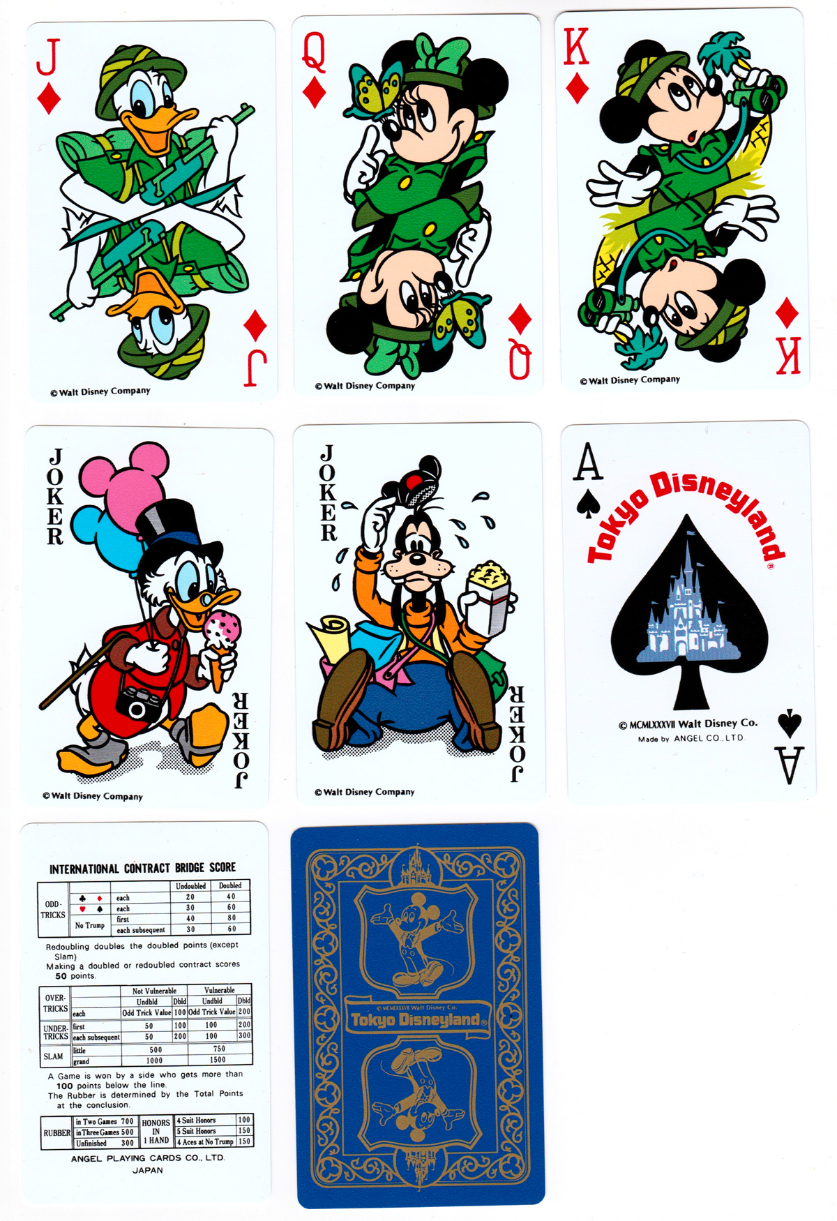 Disney branded playing cards featuring all the famous Disney characters; available for purchase at Tokyo Disneyland in 1987, manufacrted by Angel Playing Card Co, Japan. Each suit has a distinctive theme — wild west for clubs, mediaeval for hearts, sci-fi for spades, and safari for diamonds. Scrooge McDuck and Goofy are shown having fun at a theme park on the jokers. The pack also includes a scorecard for contract bridge. See the box