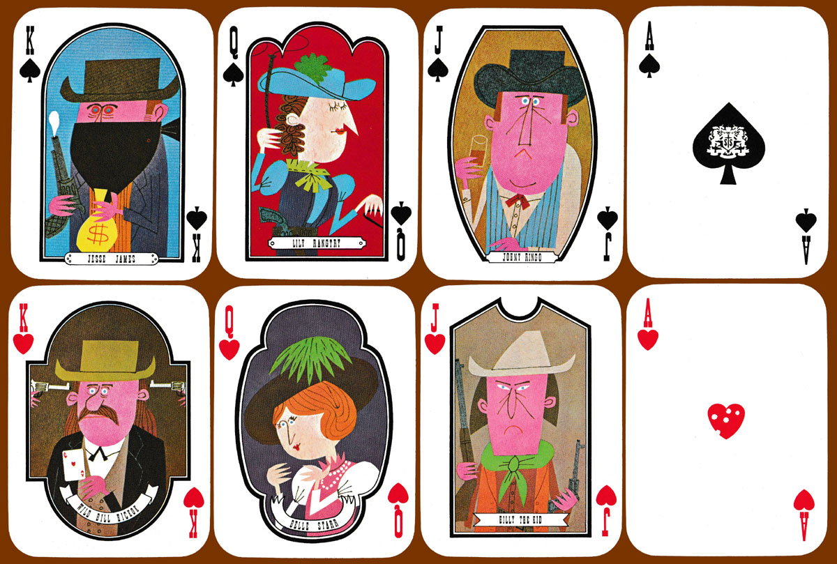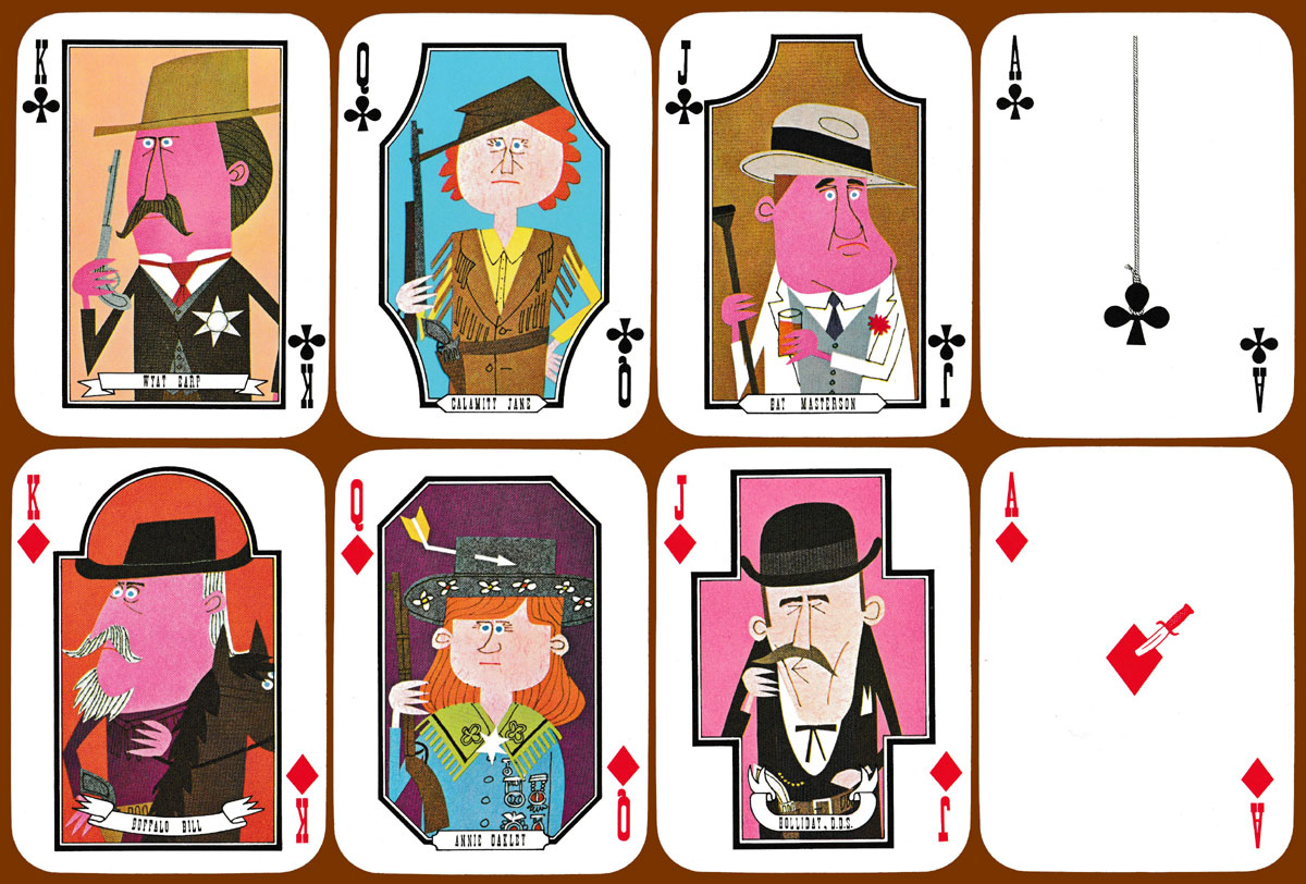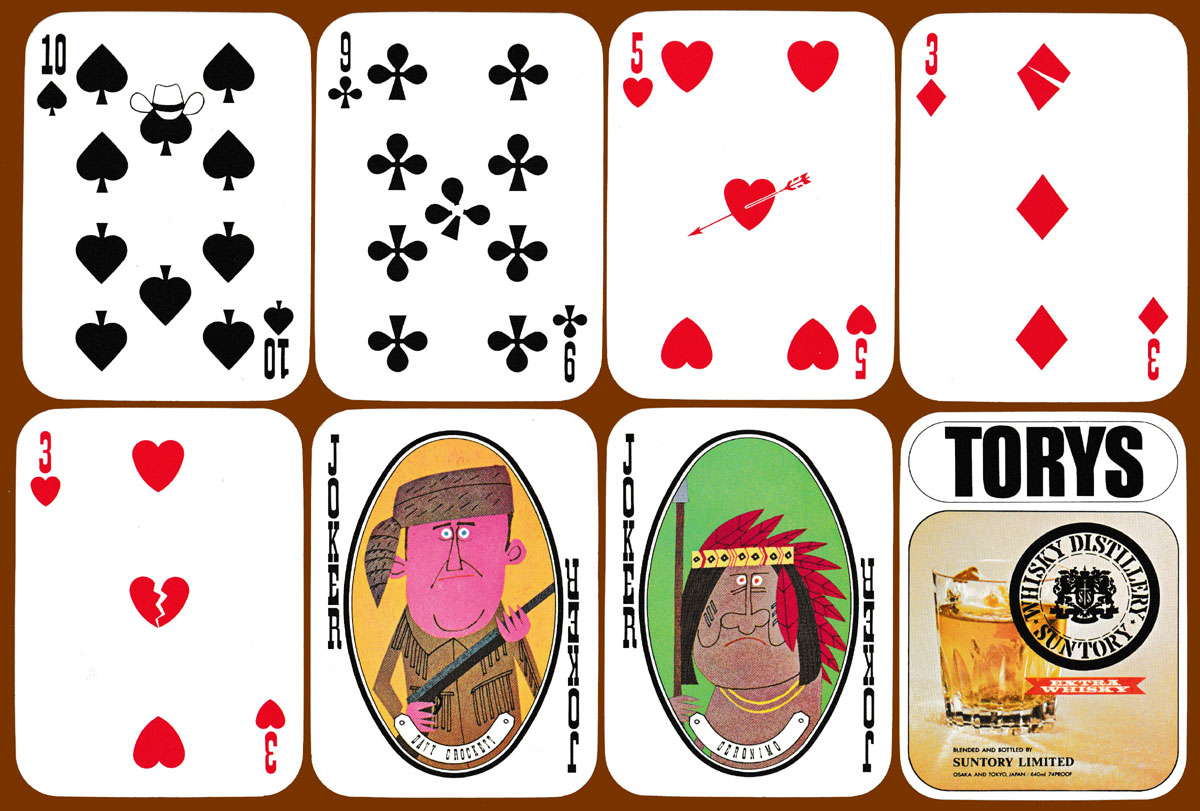 Torys is a brand of “extra whisky” blended and bottled by Suntory Limited. To promote it, Suntory employed Ryohei Yanagihara to create a series of comic portraits of characters from the American Wild West. These include Jesse James, Calamity Jane, Annie Oakley, Buffalo Bill, and Billy the Kid. Davy Crockett and Geronimo appear on the Jokers. A different background colour has been used for each of the court cards and Jokers. There are small, additional touches on the Aces and some of the pip cards. An advert for Torys whisky is featured on the reverse.
