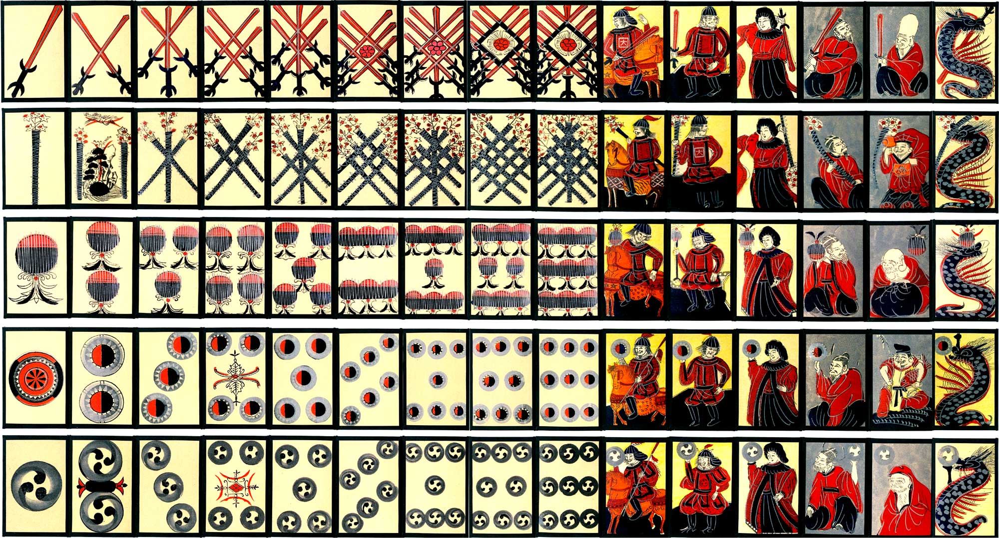 Above: 30 cards from an 18th century hand-painted Unsun Karuta pack. The complete pack has 5 suits of 15 cards: Cups, Swords, Coins, Batons and Tomoe or Drums. Each suit has six court cards: Un (a god of good luck or, in one instance, Daruma, a Zen Buddhist); Sum (an enthroned Chinese official); Sota (a maid); Robai (a dragon which has been transferred from the Portuguese aces to the Japanese court); Kiri or Koshi (King or other enthroned person), and Uma (Cavalier or simply a horse). There are also numerals 9-1, the aces being represented simply by a single suit symbol without a dragon.
