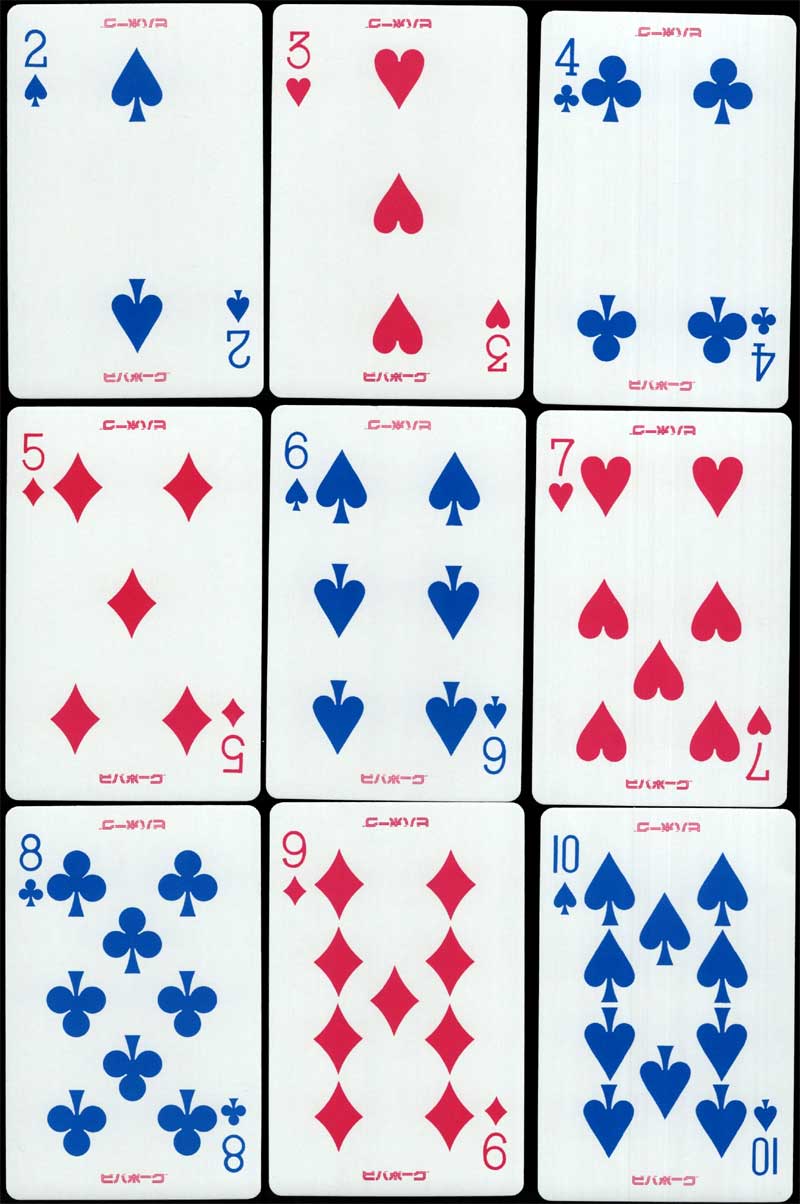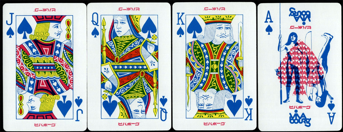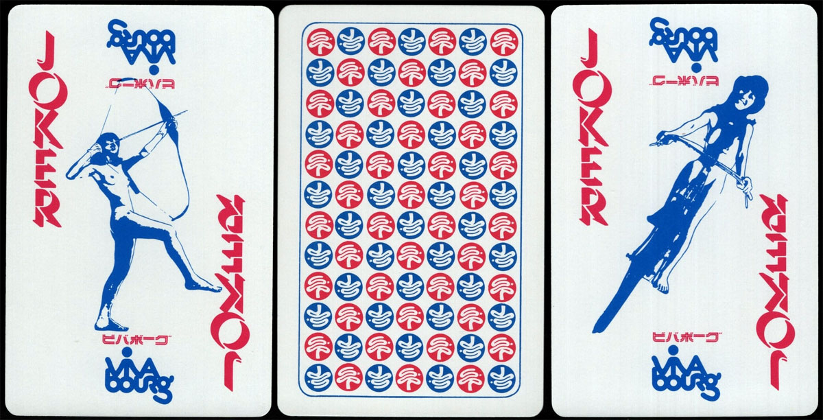 “ViVa Bourg” appears to have been a brand with a unique visual identity relating to sports or performance arts that had a significant presence in Japan, which led to a partnership with Nintendo for the production of these playing cards. All the cards have the “ViVa Bourg” branding in Japanese at the top and bottom of each card, with special aces and jokers featuring sports or arts and the logo. The court cards are international poker style with blue and red suit symbols. The back design is a unique logo or a stylized motif created for this specific deck.