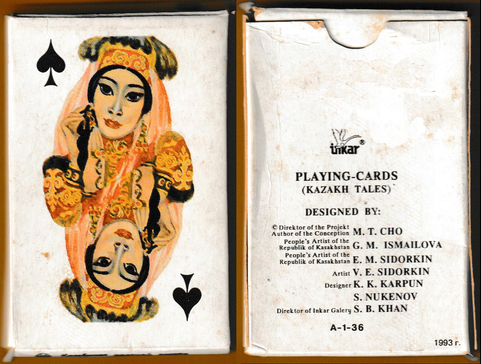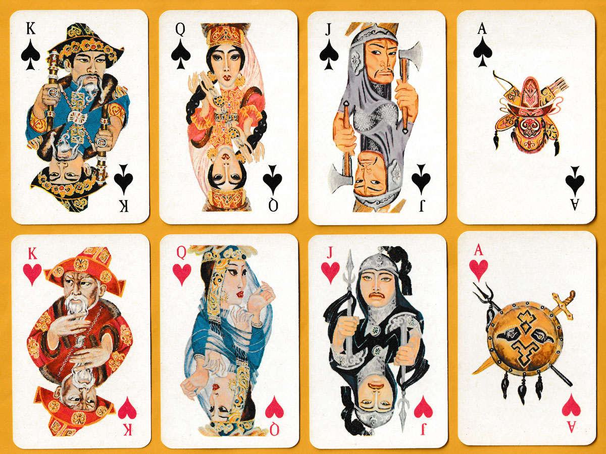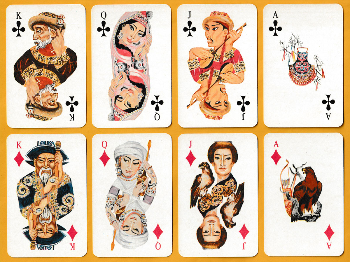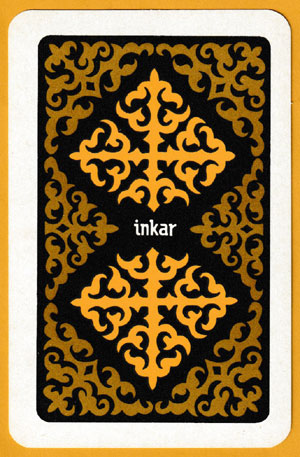 Kazakhstan only became fully independent in 1991 so this may have been one of the first packs produced post-independence. The bold designs by K.K. Karpun and S. Nukenov were inspired by Kazakh folk tales. The portraits on the court cards have a certain cinematographic quality about them but they are not identified. The aces are decorated with weapons, shields, headgear, etc. The indices are in English (as is the text on the box) so the pack was probably intended for the tourist market. Apart from the designers, various artists’ and directors’ names also appear on the back of the box. The cards were made for the Inkar Gallery (or “Galery”), whose name appears both on the box and as part of the back design • see the box