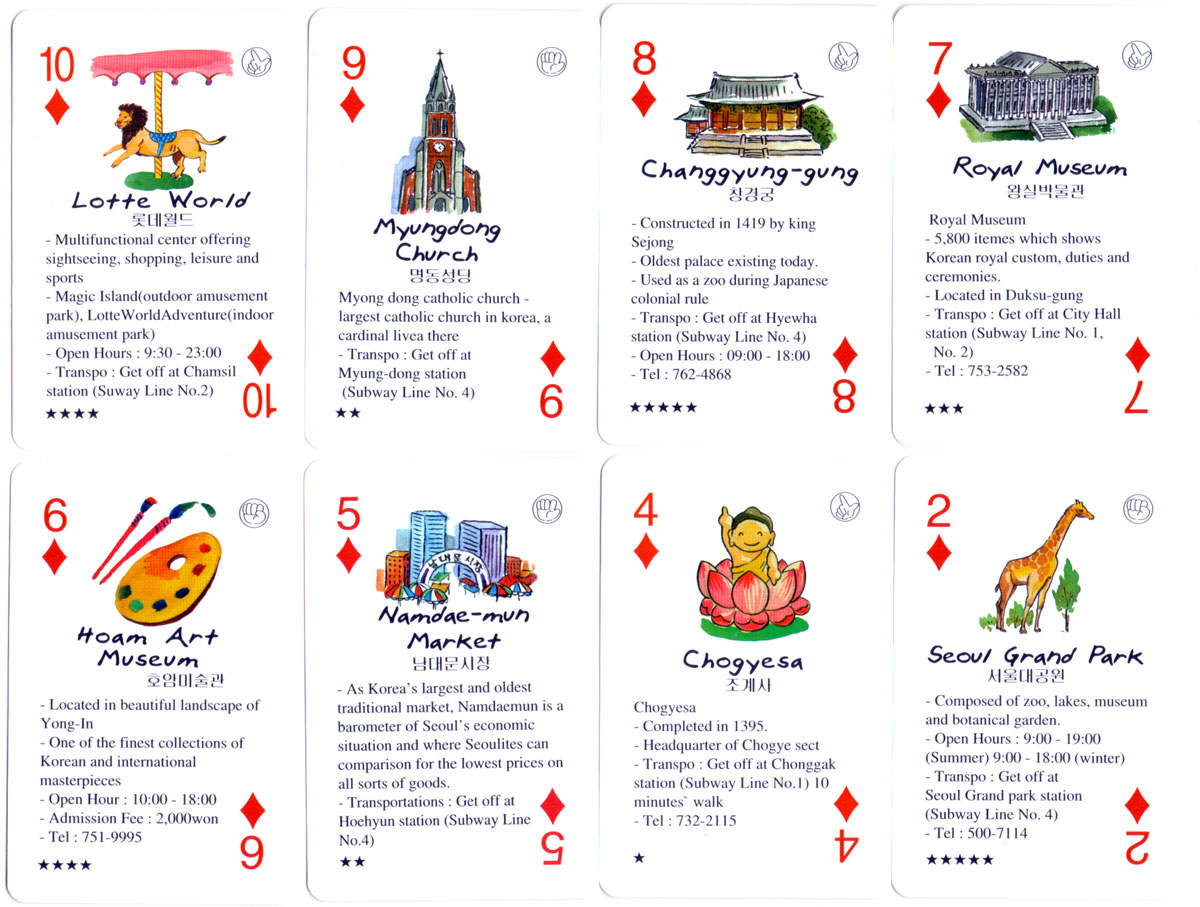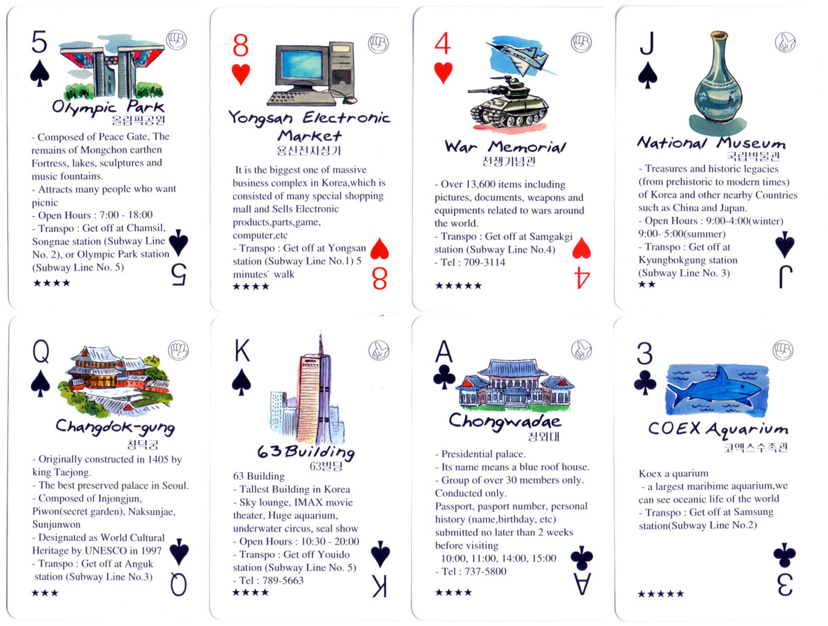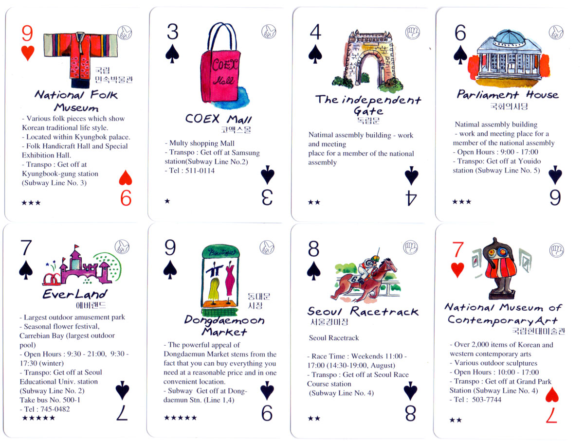 Each card has a colour drawing of a Korean building, museum or tourist attraction with a brief description and details of how to get there.