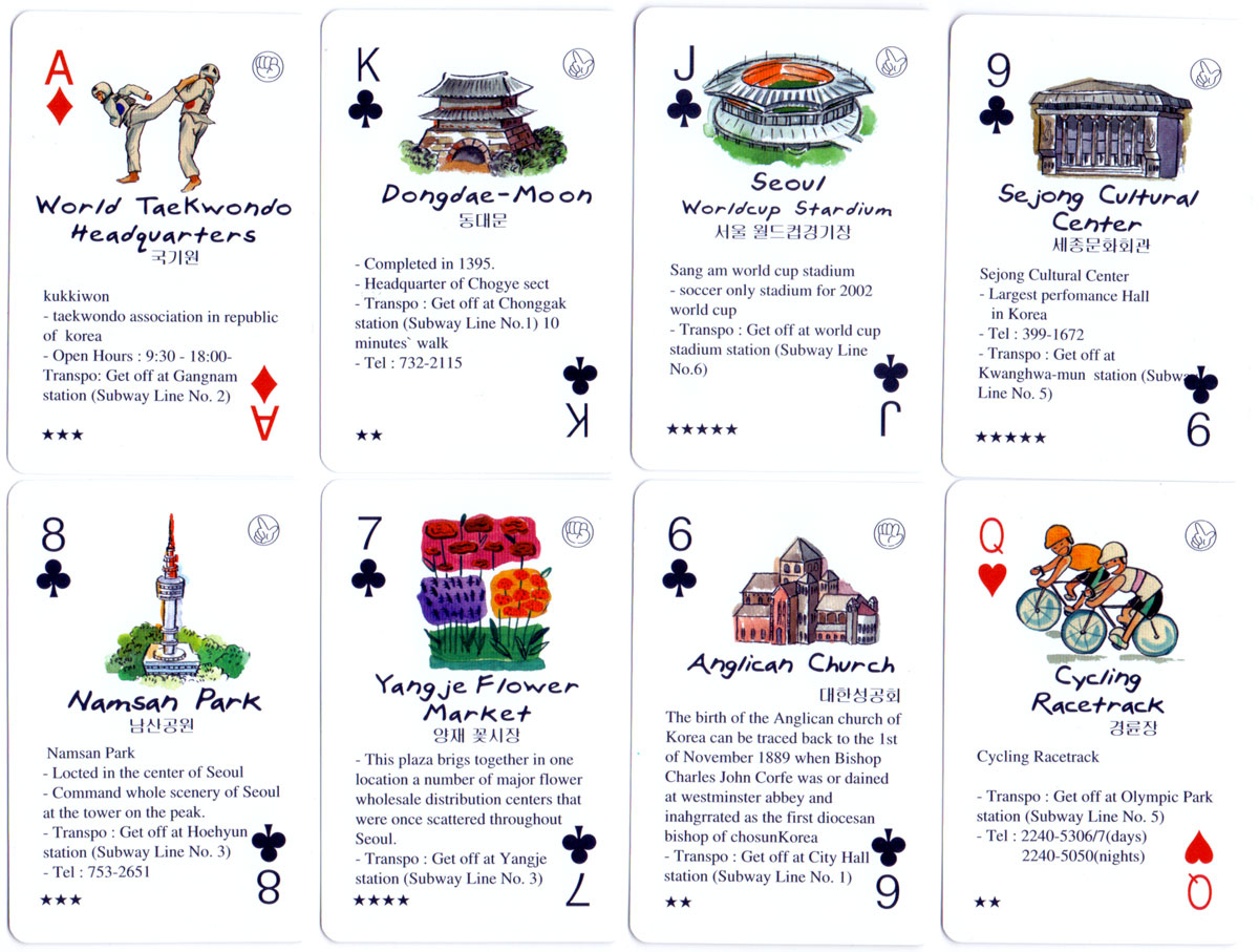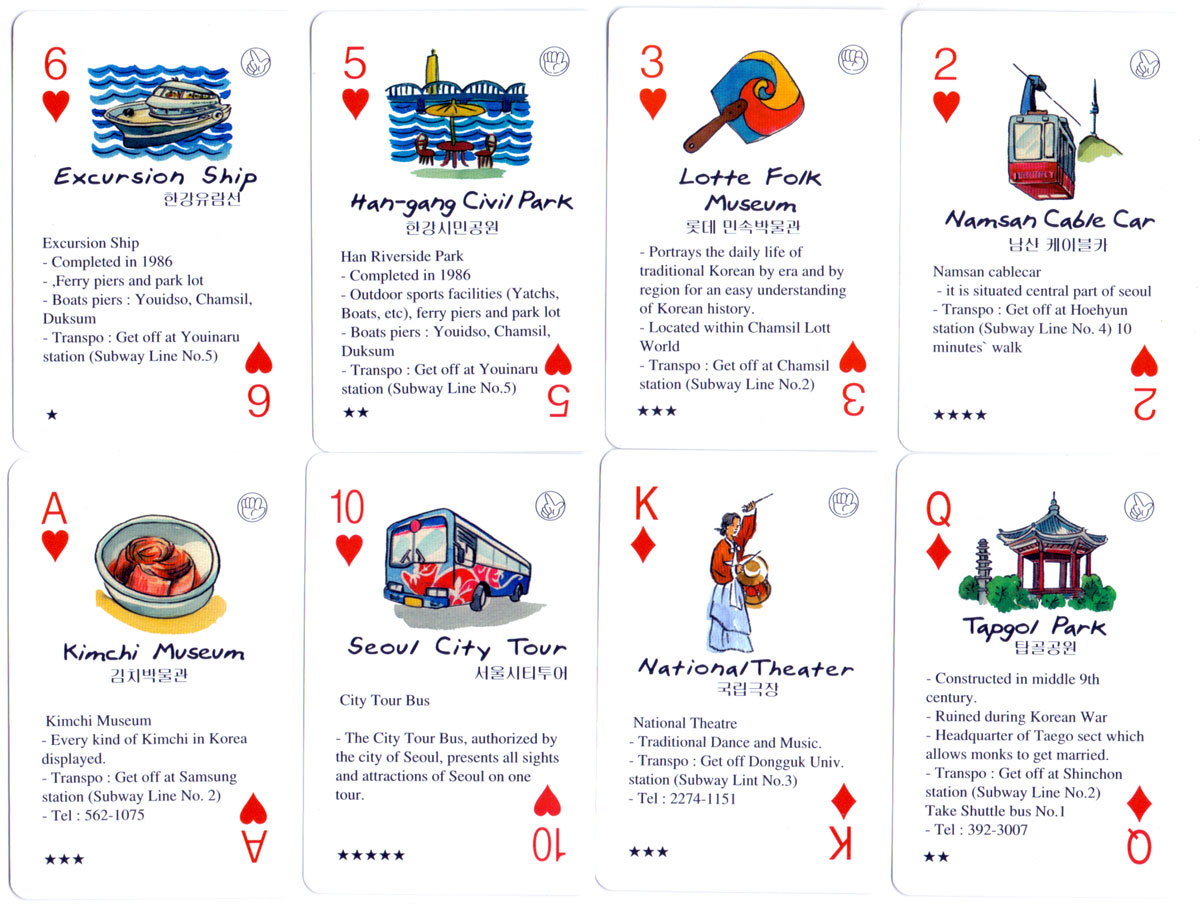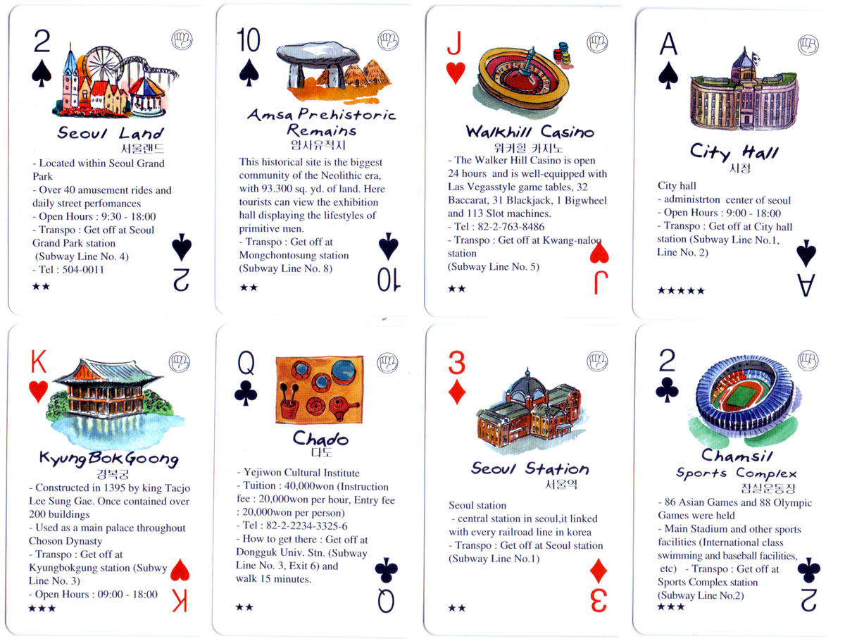 Each card has a colour drawing of a Korean building, museum or tourist attraction with a brief description and details of how to get there.