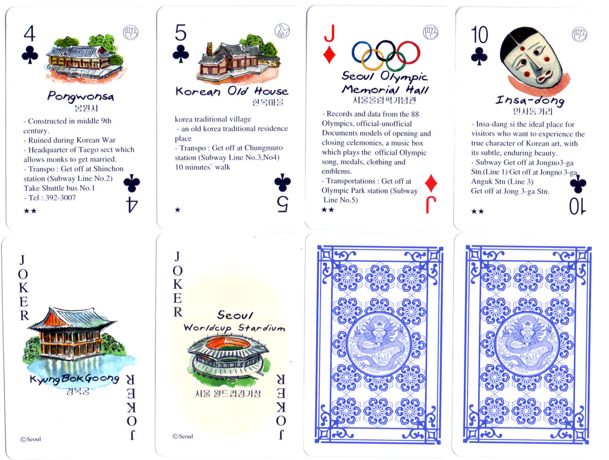 In these ‘Souvenir of Korea’ playing cards each card has a colour drawing of a Korean building, museum or cultural attraction with the title in handwritten letters and Korean printed script, and a brief description and details of how to get there printed beneath in dodgy English. There is also some kind of star rating system shown on each card. The two Jokers repeat two of the images from the cards. The Internet address printed on the box [www.folkartkorea.com] appears to be defunct.