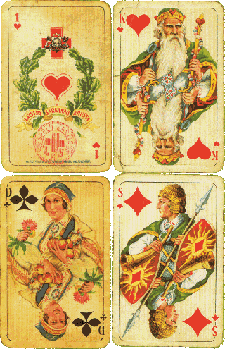 Above: Reinholds Kasparsons, a popular Latvian illustrator of the day, designed this pack which was published as The Best Quality Playing cards No.1 in 1932. This was the 3rd pack produced in Latvia. The pack was re-issued during the period of the 1st Russian occupation in 1940/41, with the inscription on the Ace of Hearts replaced by LPSR (Latvian Soviet Socialistic Republic).
