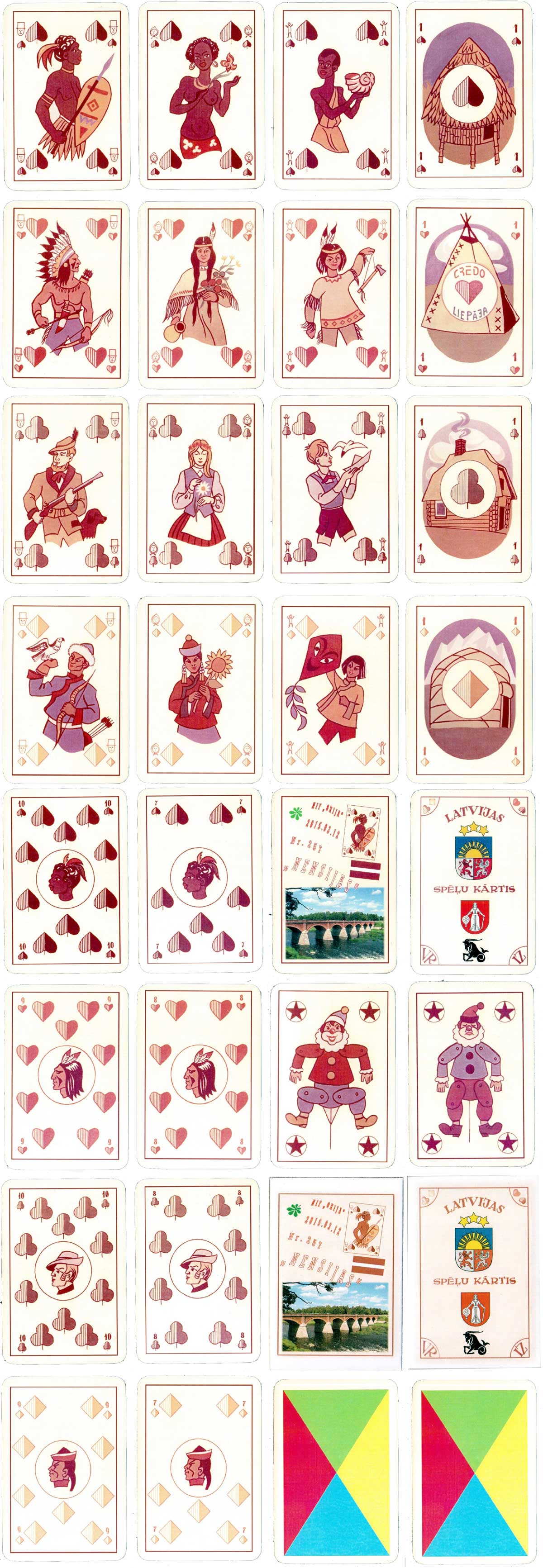 “Four Races” playing cards were designed by Latvian artist Vilnis Rasa in 1989, published by Jānis Mētra as “Latvijas Pasjansa” (Latvian Patience) and printed in Lithuania by Albinas Borisevicius at his “Orija” colour digital printing works in 2007. Re-printed as “Nensijas” in 2015. The suits are hearts, spades, clubs and diamonds, total 32 cards + 2 jokers + 2 extra cards.