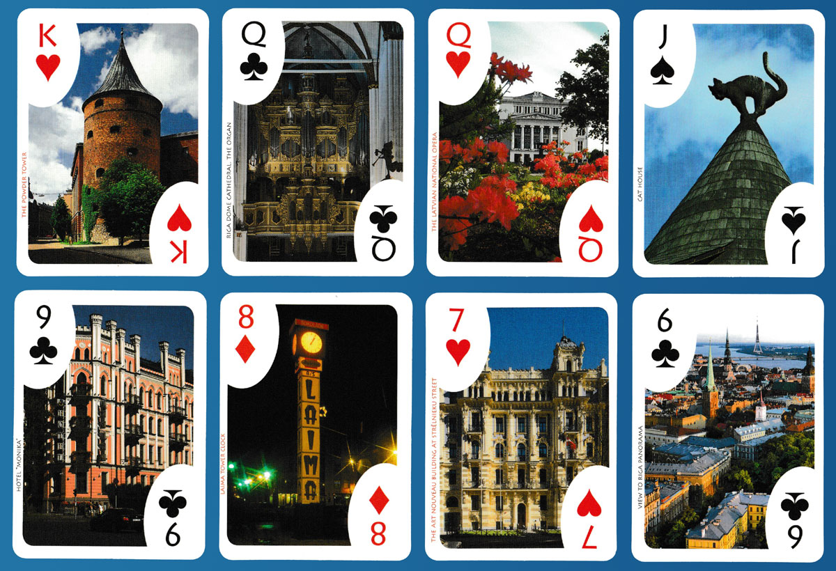 Playing cards with colour photos of buildings and monuments in and around Riga.