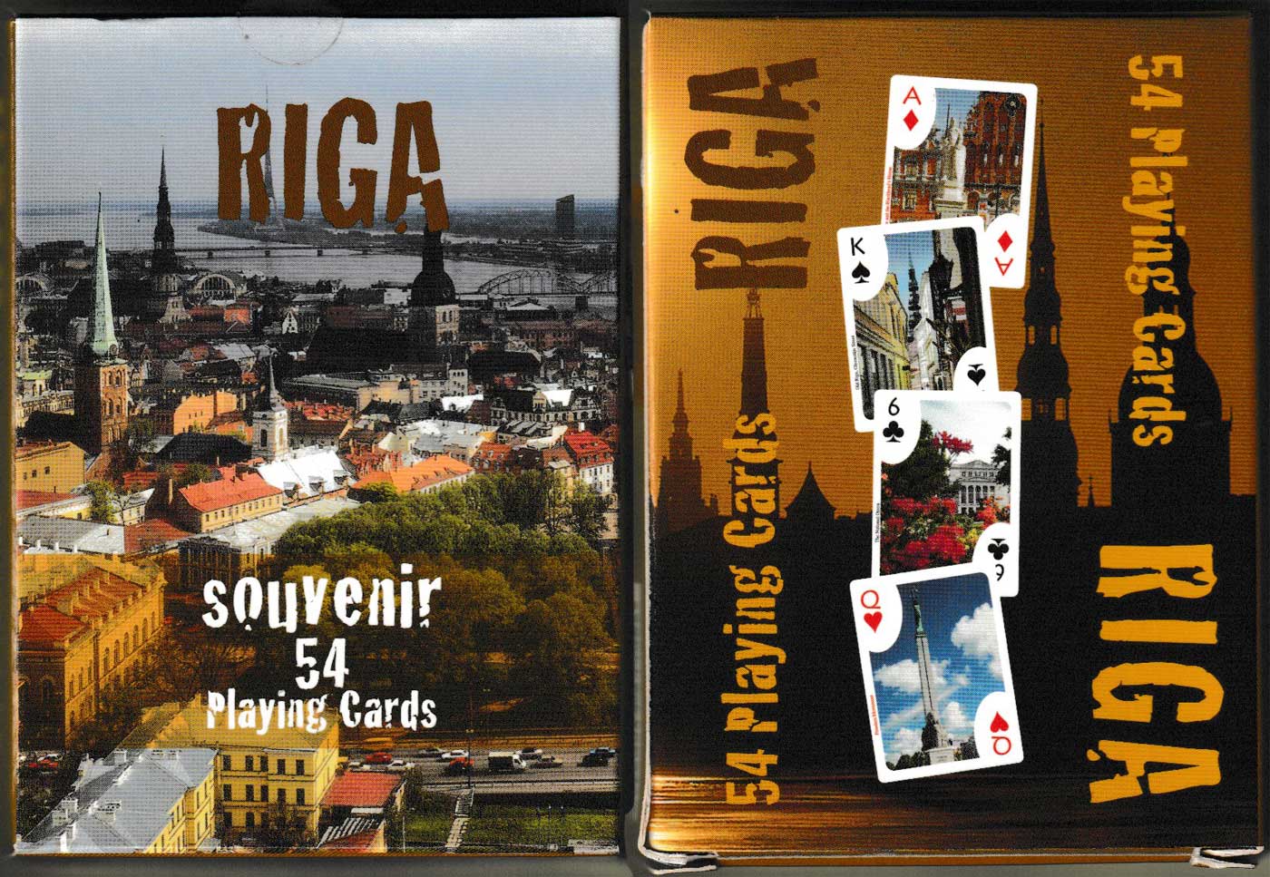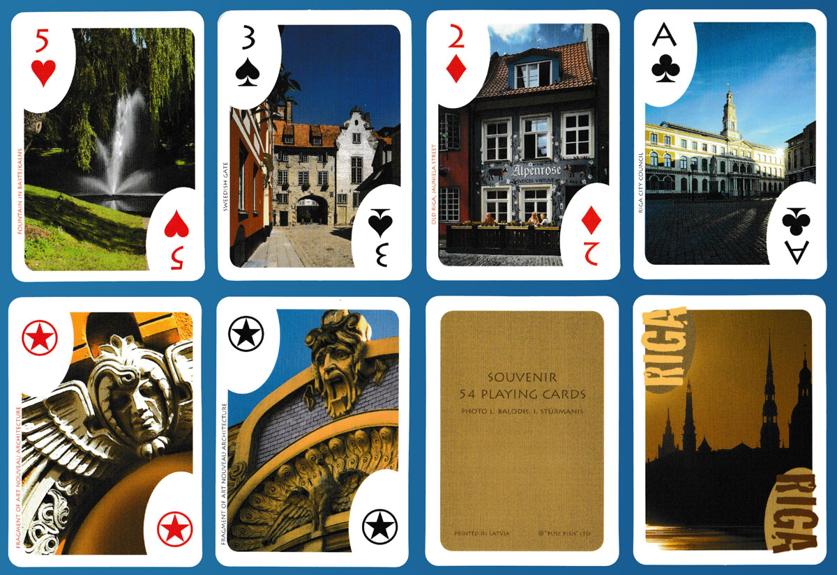 Above: Riga Souvenir playing cards published by Puse Plus Ltd, Riga, Latvia, c2010. Printed in Latvia. 52 cards + 2 Jokers + title card in tuck box. Size: 63 x 88 mm. © “Puse Plus” Ltd.