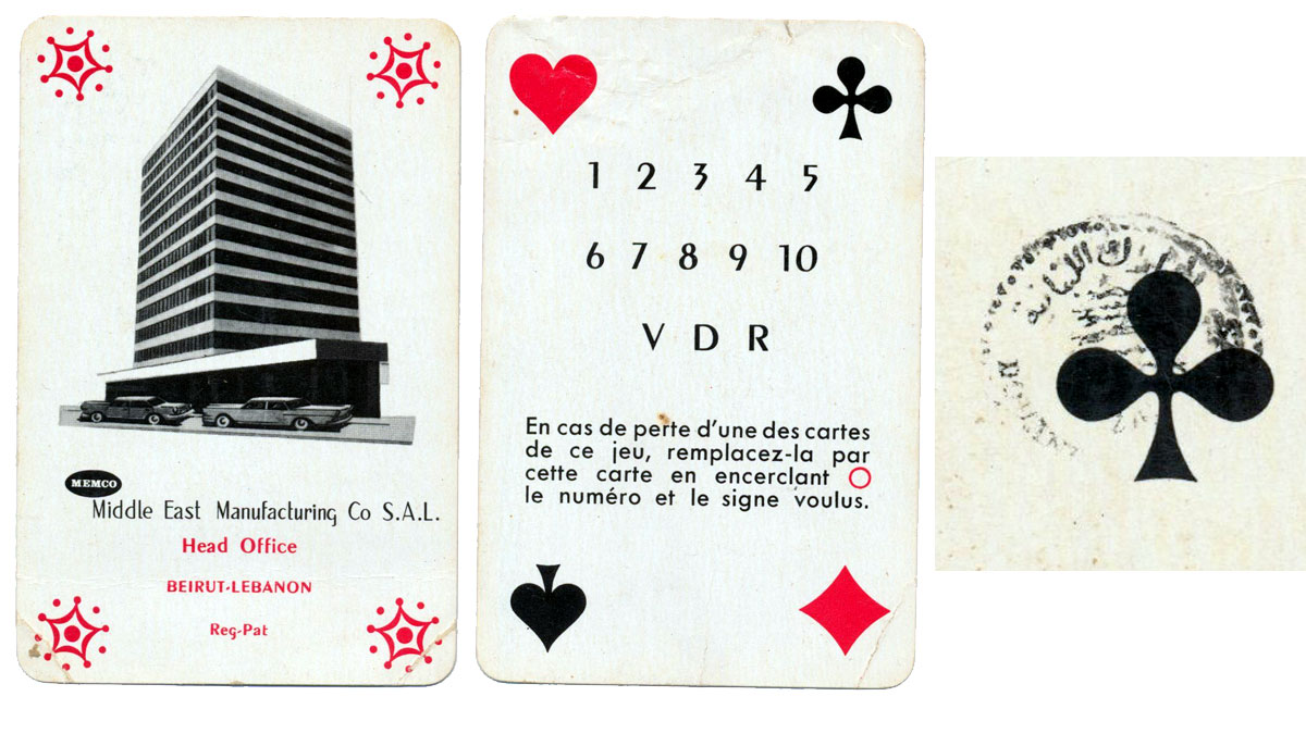 Above: ‘Eldar’ upholstery fabrics advertising deck produced (probably imported) by Middle East Manufacturing Co (MEMCO) of Beirut, Lebanon, c.1960. The legend “Memco Beirut Lebanon” is printed on the three hearts court cards and on the extra joker, which also shows a photo of the head office. The Alibaba joker holds a fan of four aces. The customs duty stamp on the ace of clubs, which is barely visible, has an inscription around a cedar tree. Images courtesy Matt Probert.