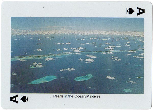 The second of a two-pack souvenir set from the Maldives (the companion to Fish playing cards). Each of the 52 cards has a different photo of the Maldives, while the two jokers are of one design. Cards manufactured in India.