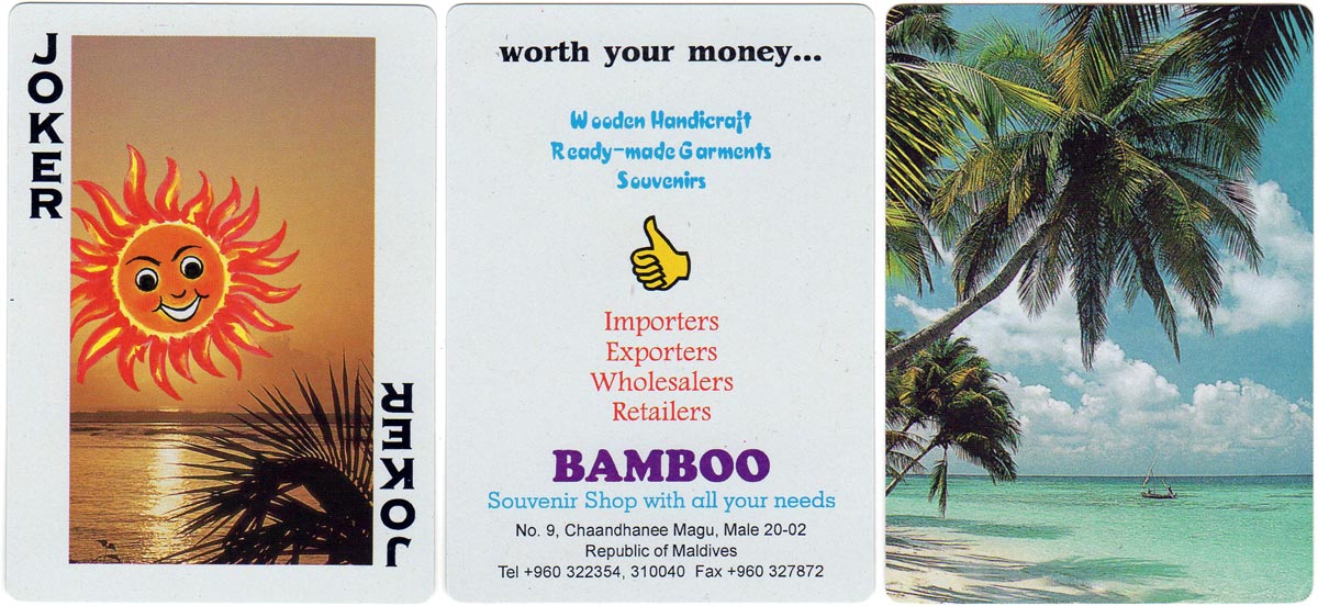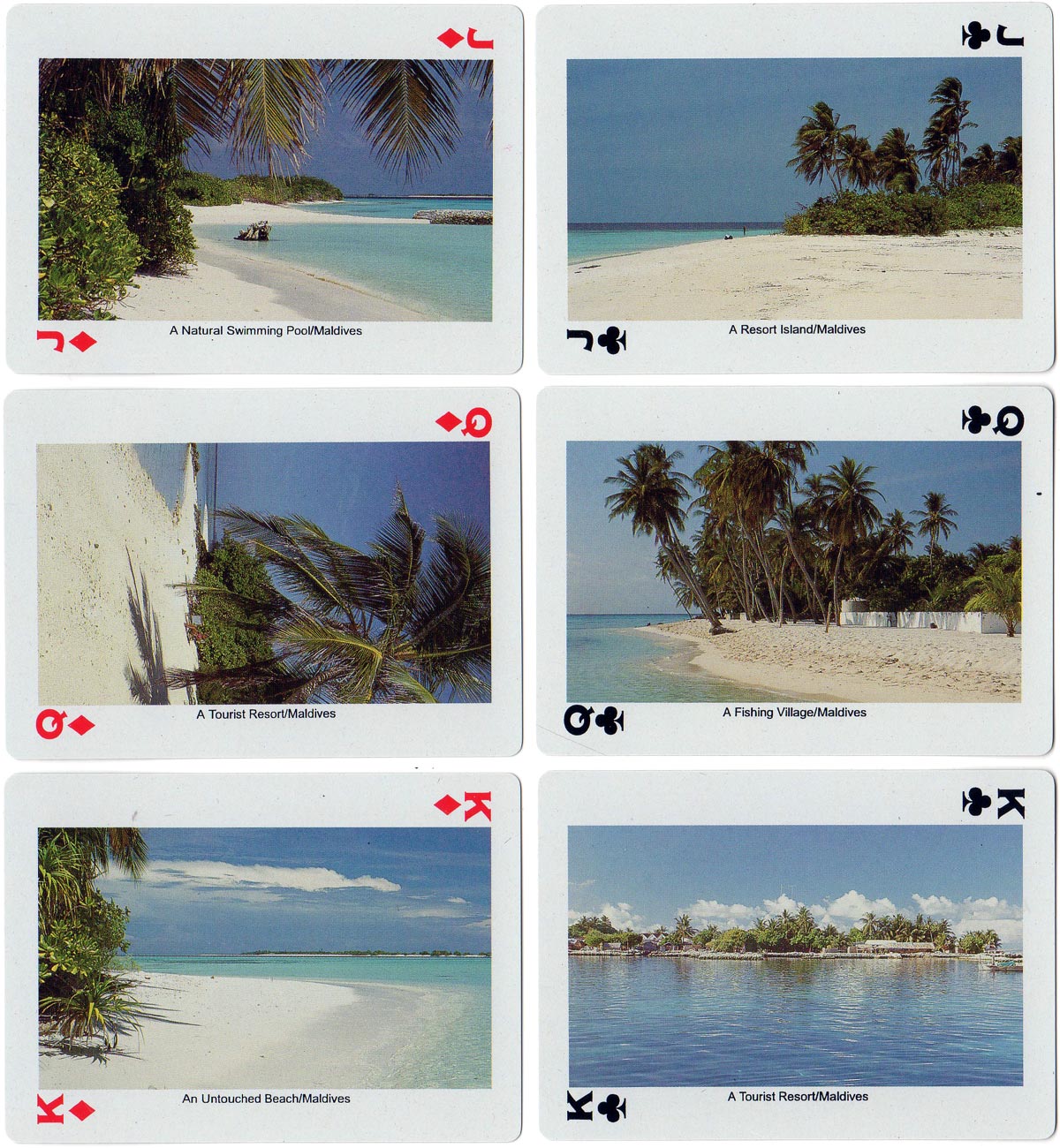 Above: Maldives Scenery playing cards published by Bamboo Souvenirs, made in India. 52 cards + 2 jokers + extra card in box.