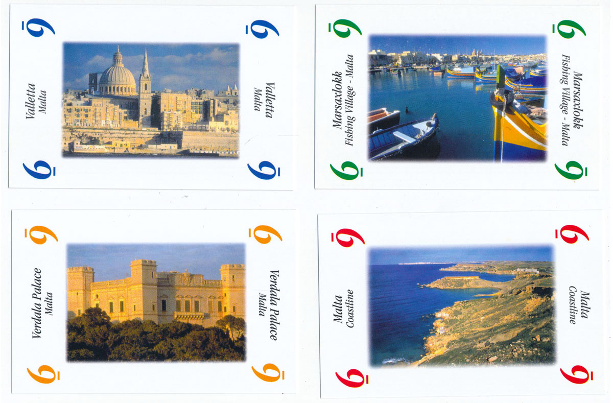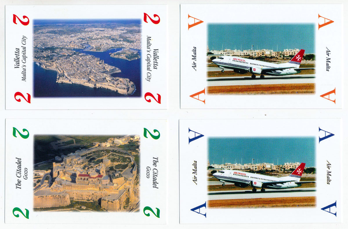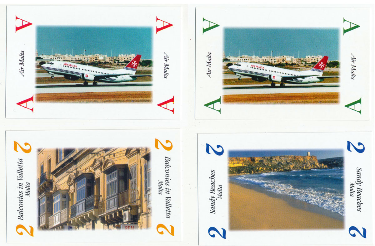 ‘Air Rummy’ playing cards published by Air Malta, late 1990s. The cards are a variation on standard playing cards using coloured indices instead of suits. The aces and court cards all carry the same images across suits but the pip cards have photographs promoting Malta as a tourist destination. The four jokers are indicated by a Maltese cross in each corner. See the Rules►
