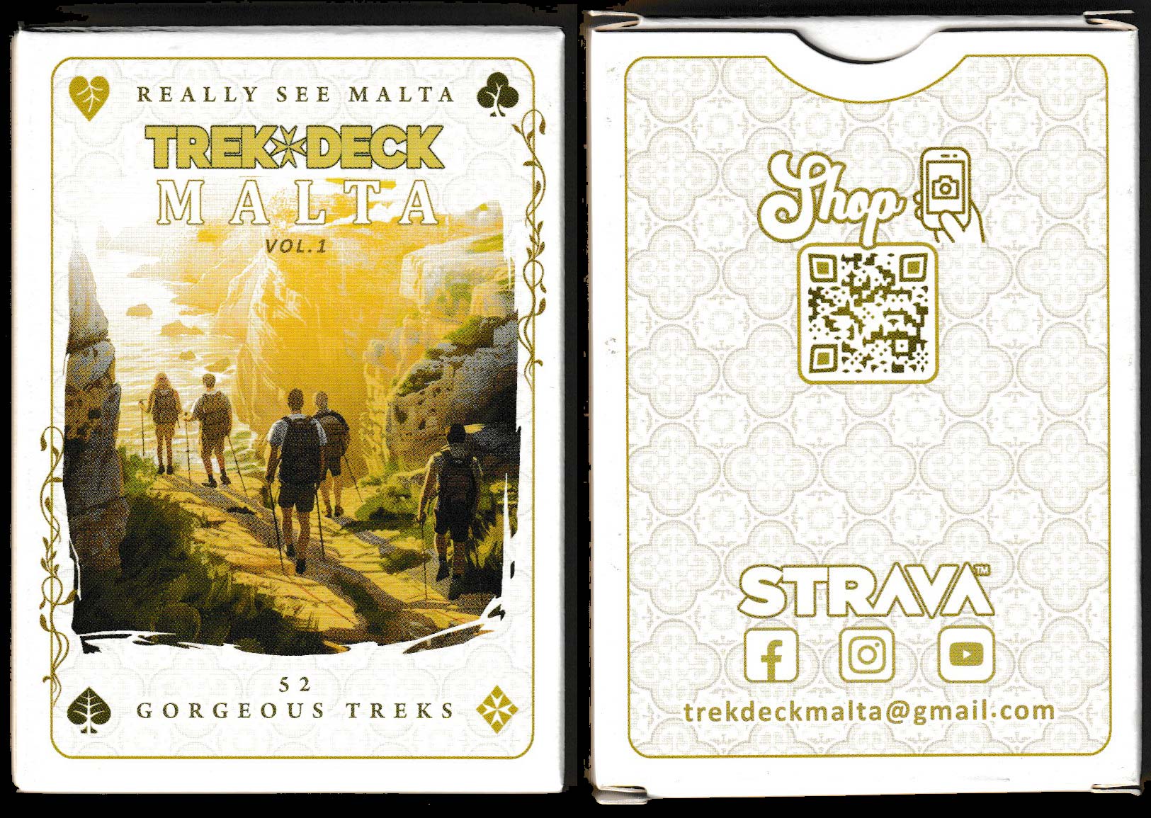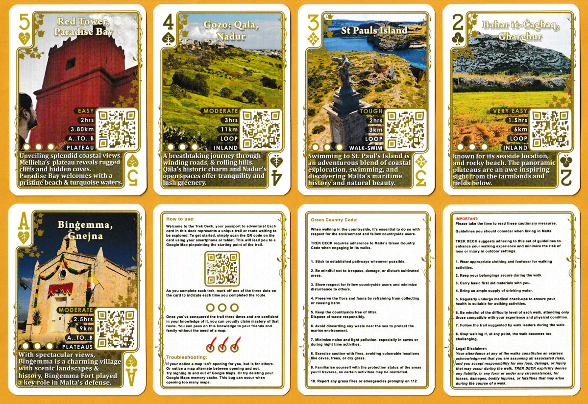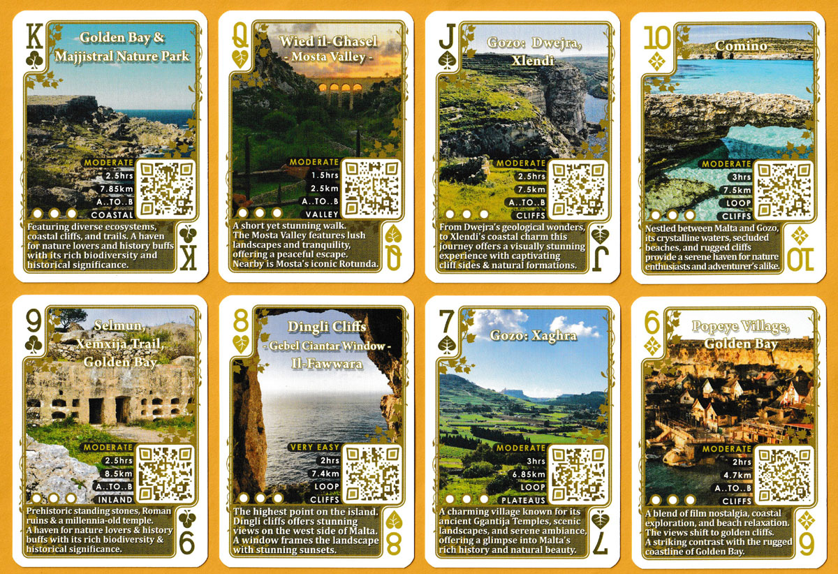 This is much more than just a souvenir pack with pretty pictures of Malta. Each card represents a trail or route which can be uncovered by scanning the QR code and following the map thus revealed. The routes are graded according to difficulty, length and type of terrain. Comino (10D) and Gozo (suit of Spades) are covered as well as the main island of Malta.
