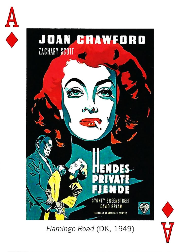 Above: Ace of Diamonds card displaying Joan Crawford from the 1949 Danish film poster "Flamingo Road," reflecting the compelling allure of Film Noir's leading ladies.