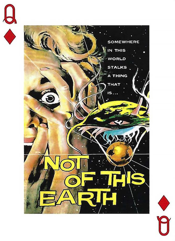 Above: playing card featuring a vintage sci-fi poster design with a distressed woman and the caption "Not of This Earth," evoking classic horror themes.