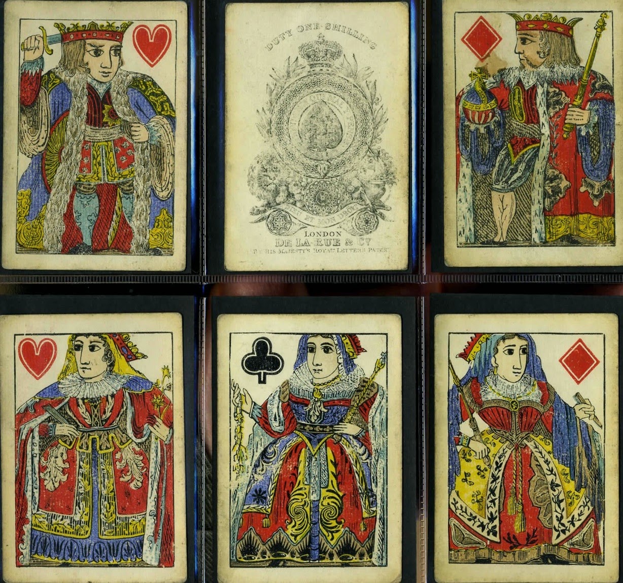 De La Rue, who invented the letterpress process for printing his cards and received the royal patent in 1831, redrew one set of his first courts so much that they are said to have been rejected by serious card-players. In the illustrated example below all the pips have a white line overlaid on them.