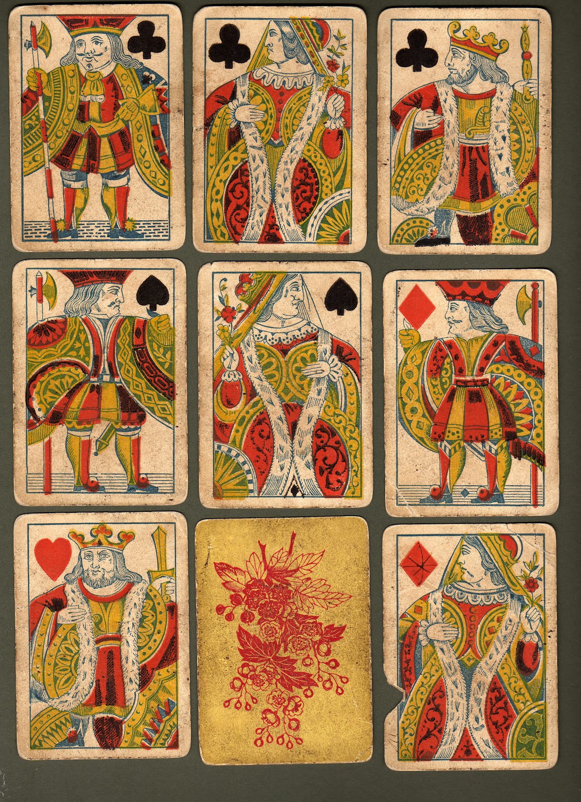 Here the KH is turned, the KD holds an orb and a sceptre, the QC is turned and holds a sceptre and necklace, and the QD holds a sceptre and a fan. The clothing has been completely redesigned and looks more realistic.