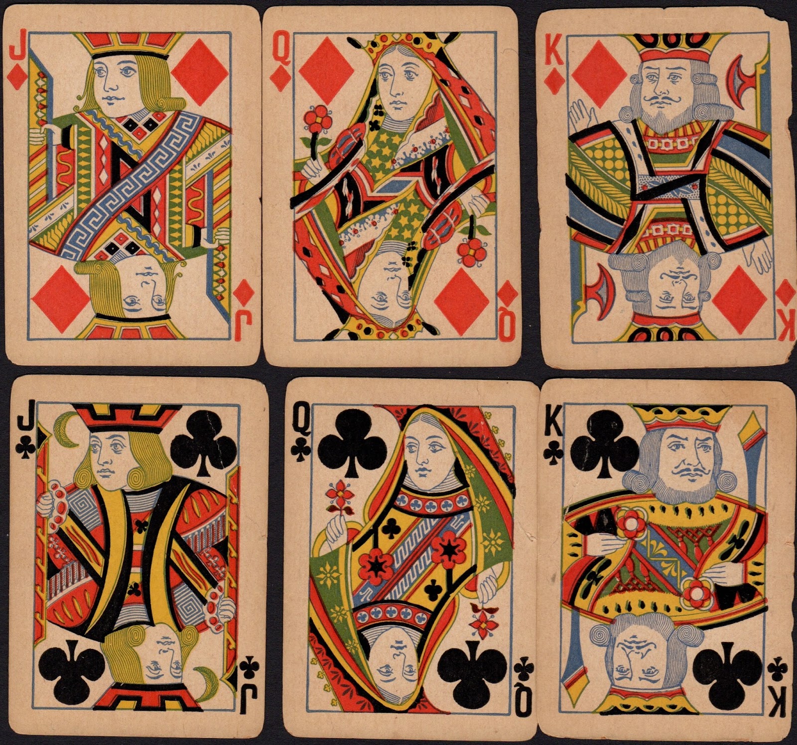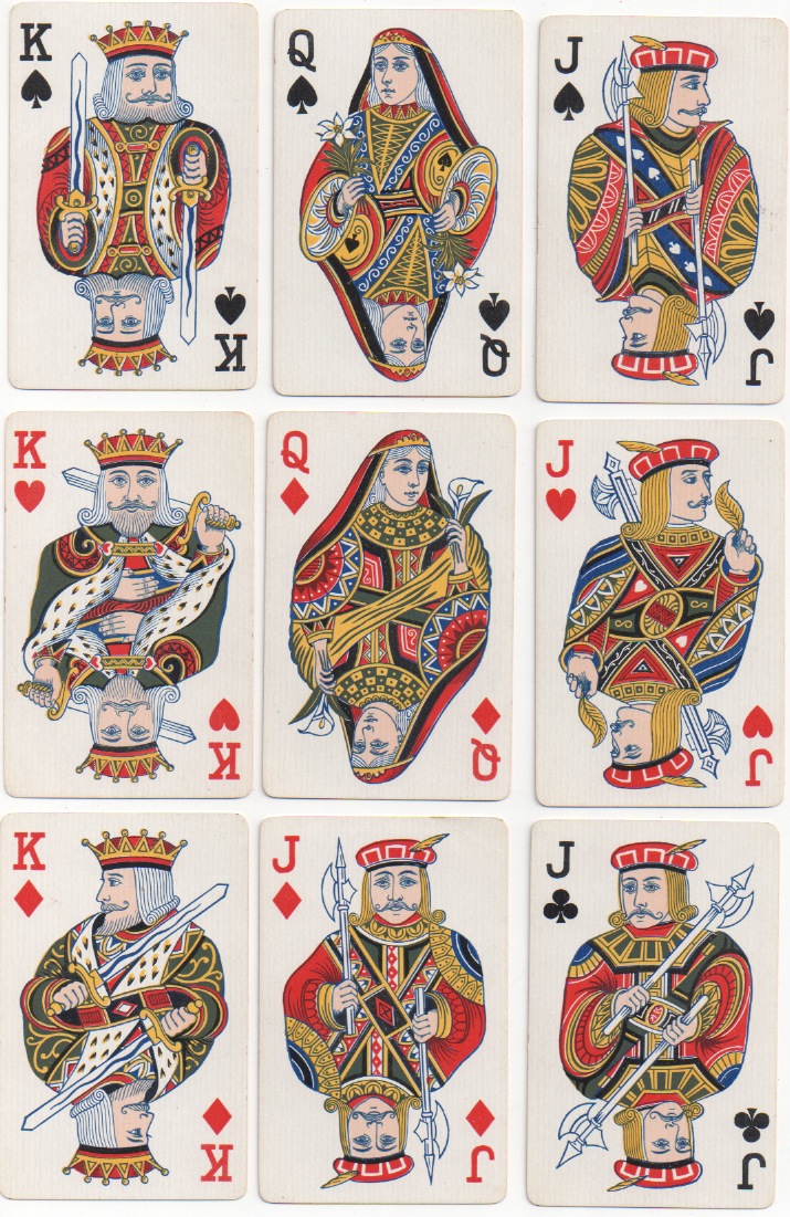 Other makers followed this trend and produced a number of interesting versions of the pattern. Goodall, for example, redrew his courts with a few alterations to the tradition, e.g. the loss of the KD's hand on the left.
