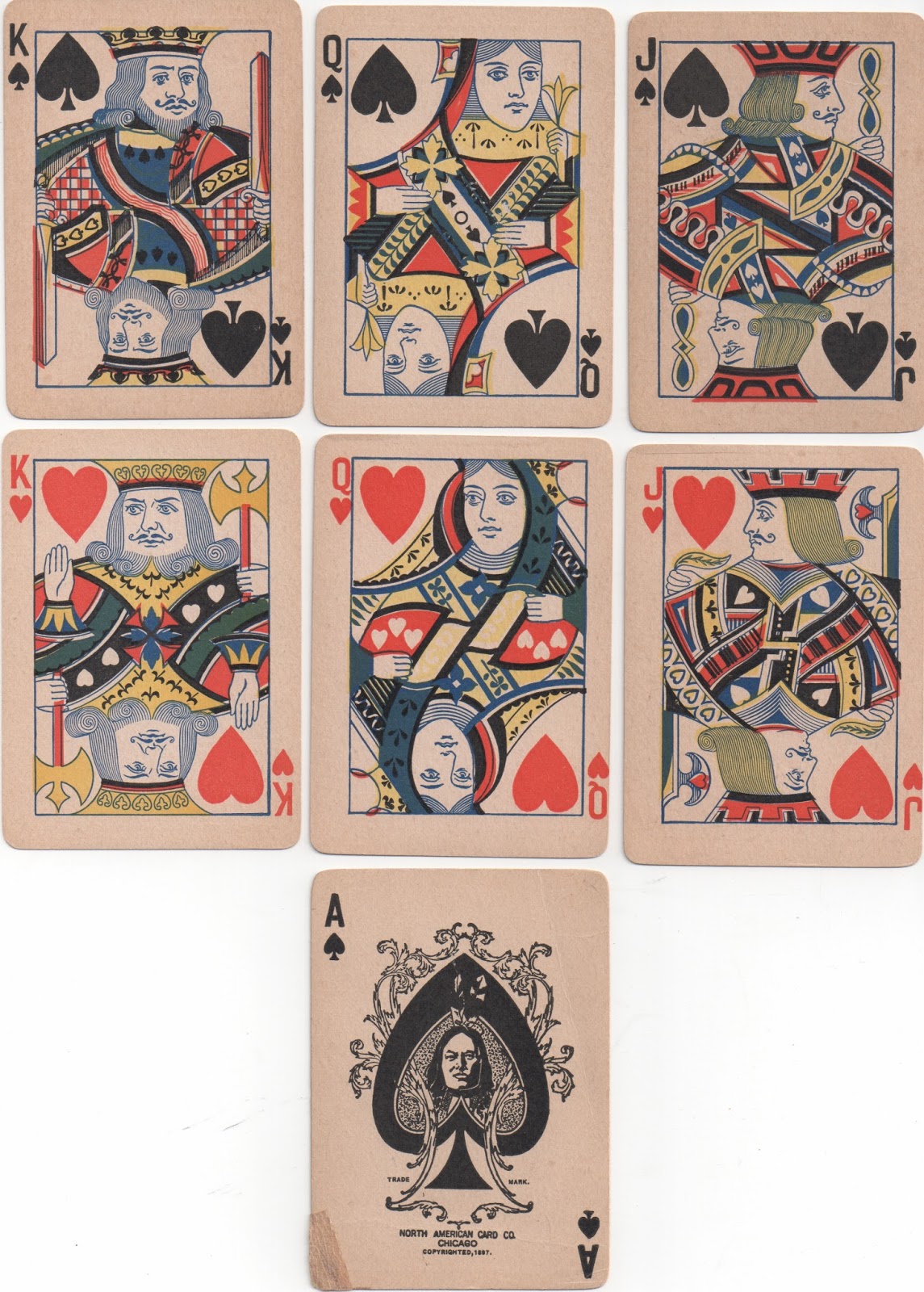 There is another version of this design from the same firm, but sometimes called the North American Card Co., in which the clothing has been changed, whilst in most cases the outline plates are the same. However, the KC & KD have had their heads altered and the QS's & QH's headdresses are different at the top by the frame line.