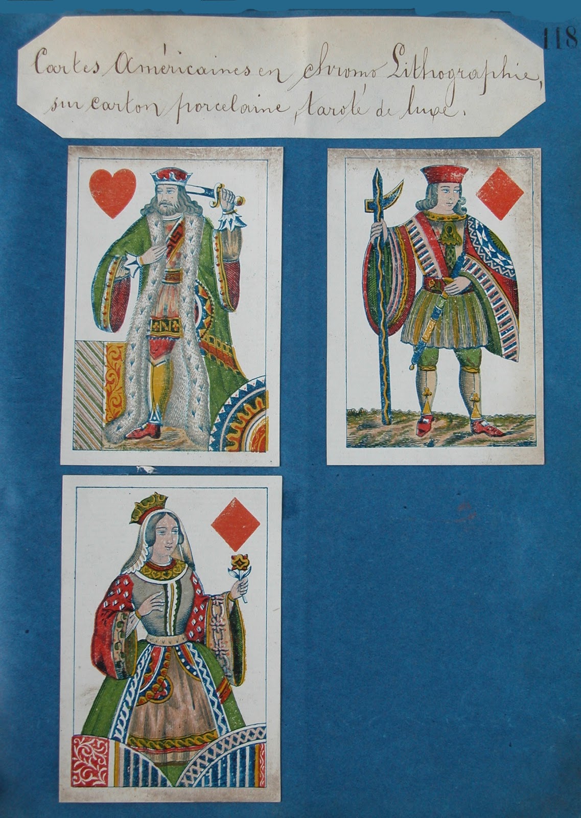These cards are very like those made by Van Genechten of Turnhout, but it's very difficult to say which ones were copied from which. In the Belgian version the figures are assigned to their traditional suits. These cards are from sample books in the Turnhout Playing Card Museum.