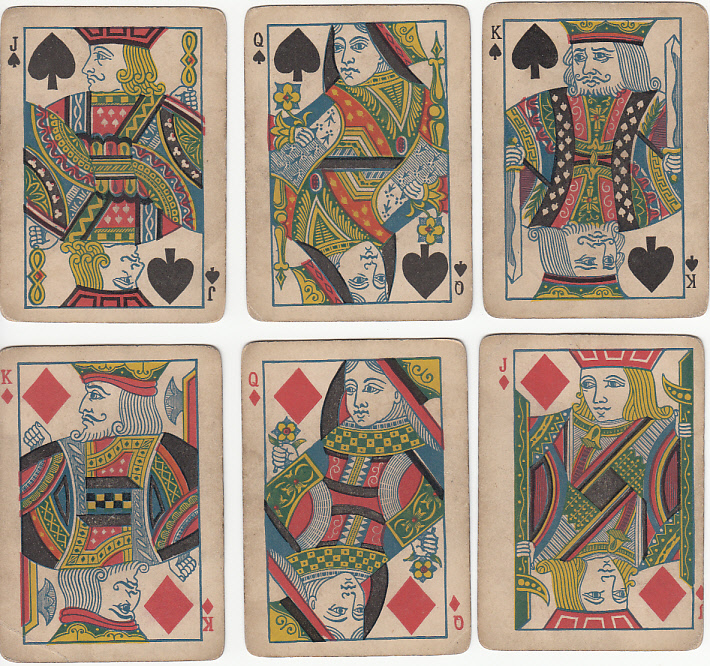 Another example is provided by Pearsall, an otherwise unknown maker from around the same time, who could be Canadian. Their courts are basically those of Dougherty, but with turned postures. However, four cards have what I call "twisted heads", that is head positions which are opposite to that of their bodies. All the spades and the JC have such heads, for no apparent reason.