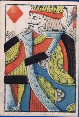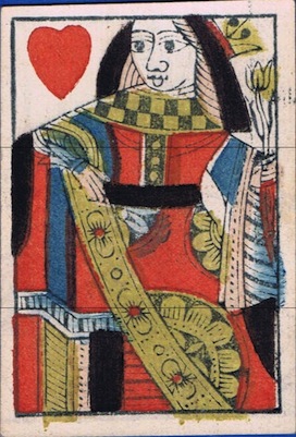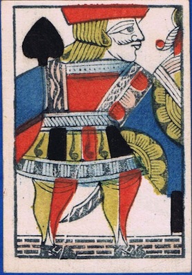 Henry French was also short-lived; he operated from 1794 to 1805 at 11 Broad Street, Bloomsbury. His extant cards are of a standard design and have the HC mark on the KH's sword. In the known examples he used Type II courts, with various colour schemes. The JS has a flat-bottomed sleeve, the QH sometimes holds a tulip and the KD sometimes has vertical lines at the bottom of his tunic (left above his leg). Other makers who used similar blocks in this period are Hunt, Hall, Gibson and T. Wheeler.