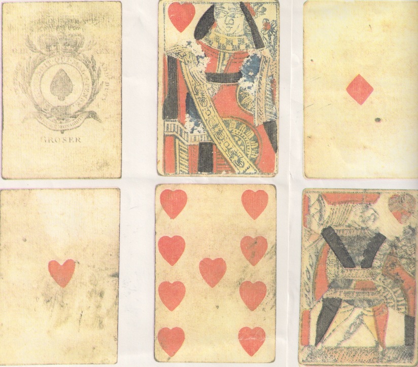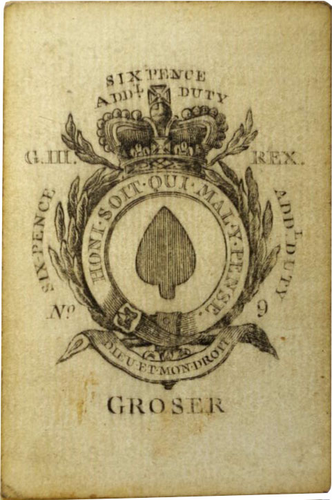 An even shorter-lived maker, as far as the records tell us, he operated from 1796 until 1802 at 5 Brook Street and then 14 Prince's Street, Cavendish Square. Maxted lists him at Brook Street in 1792, but he only appears sporadically in the directories of the period. The cards below are six of nine cards with a Groser AS from before 1801. Who made the cards is not clear, but see below for another pack that is complete.