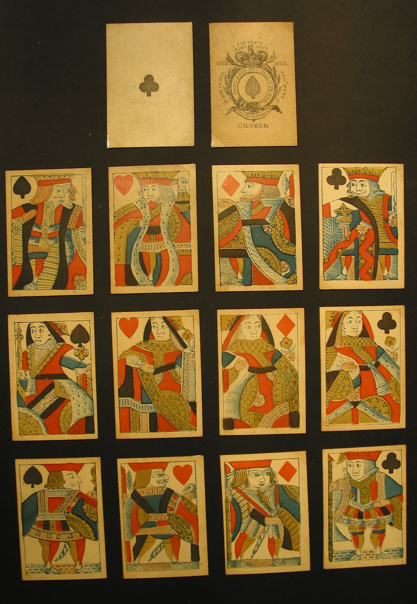 There's also another pack (below), from the Albert Field collection, with a Groser AS but, sadly, although it is complete, most of the courts are by Hunt from c.1825 (HB1 courts). The KS and the two red jacks match a Reynolds pack I have from c.1815, so none of the courts are original Groser cards.