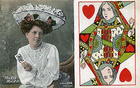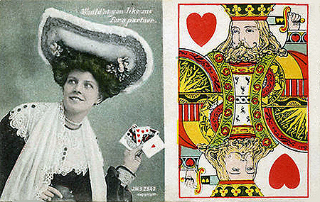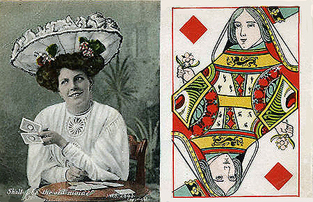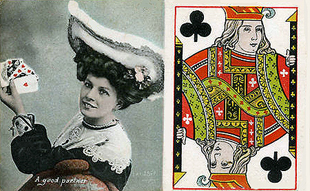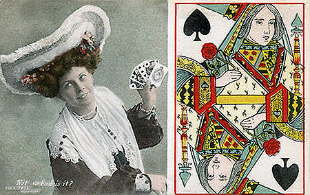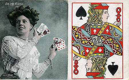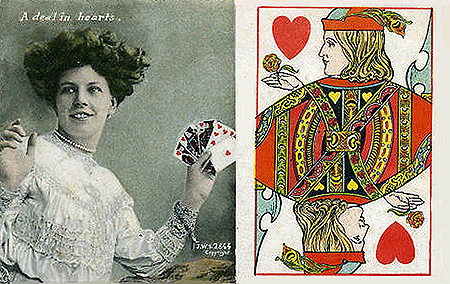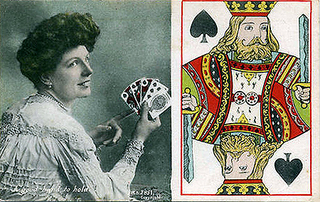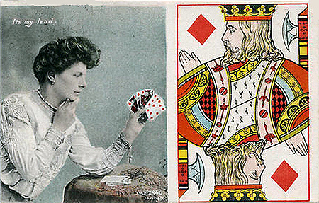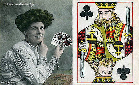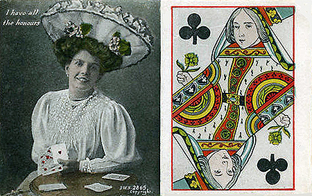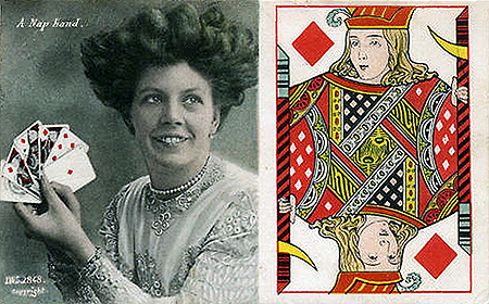 J. Welch produced a large number of postcards around the turn of the twentieth century. One set showed a young woman holding a hand of cards on one half and the other half was a playing card. The cards she is holding are those of De La Rue (see the image of the full postcard below) and there are a few number cards, with and without indices. But there's a full set of court cards, which have clearly been designed specially for the postcard firm. They would have made a splendid pack of cards!