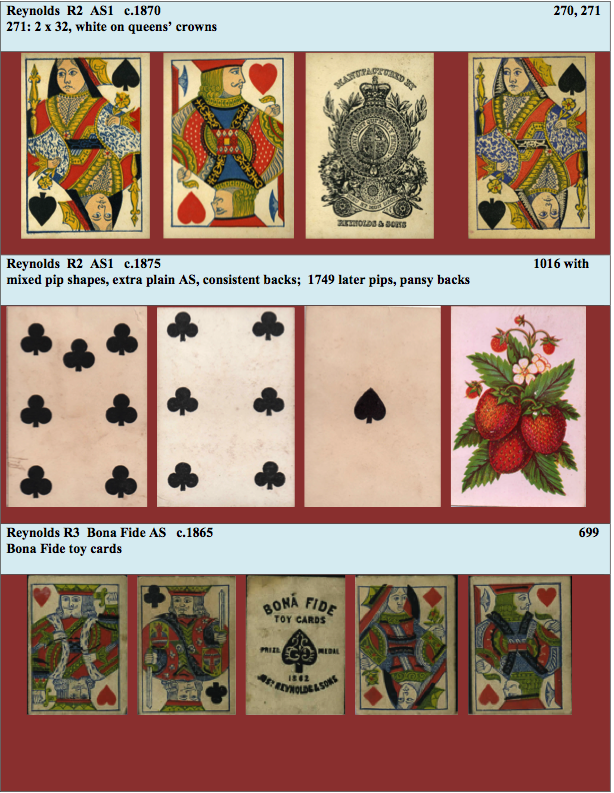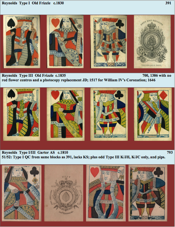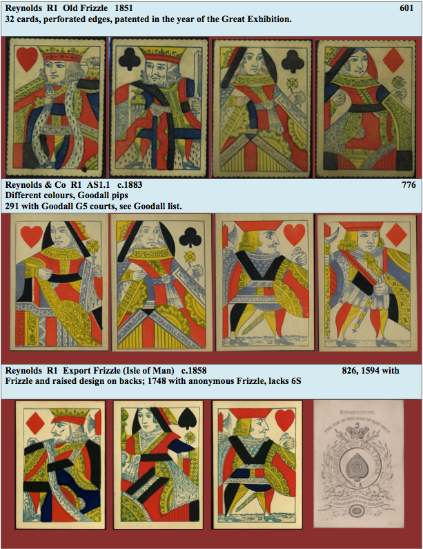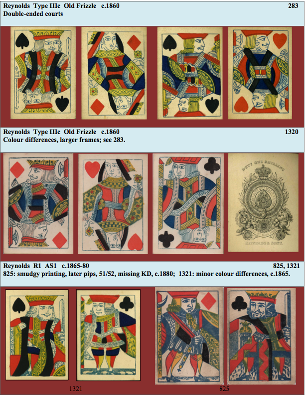 Double-ending was applied to the Type III courts, possibly as early as 1850, but the designs were recut, not stuck together from two existing head ends. In the Old Frizzle period, too, the single-figure courts were redesigned into a house style, R1, which were used into the 1880s, as there are packs with a Reynolds & Co. AS.
